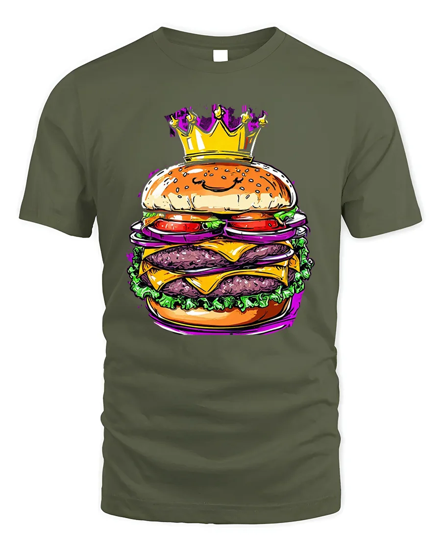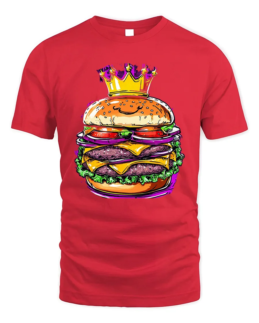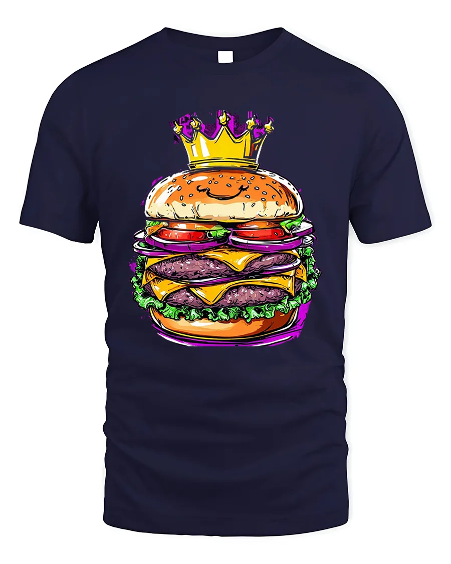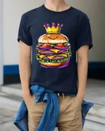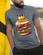 Featuring a juicy double cheeseburger topped with a golden crown, this vibrant graphic captures the ultimate symbol of flavor royalty. The rich neon tones and playful art style make it a fun, eye-catching choice for foodies who appreciate humor and creativity in their fashion.