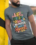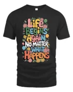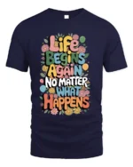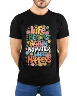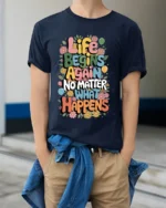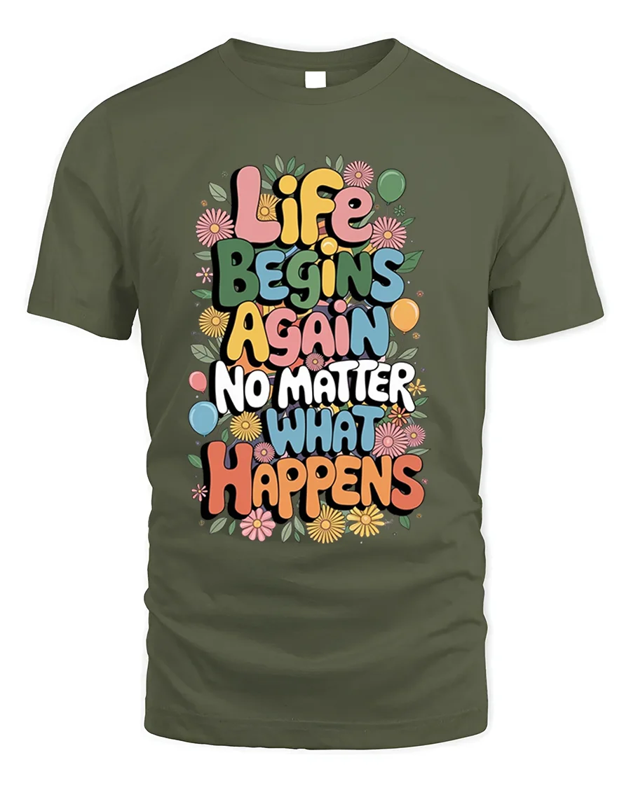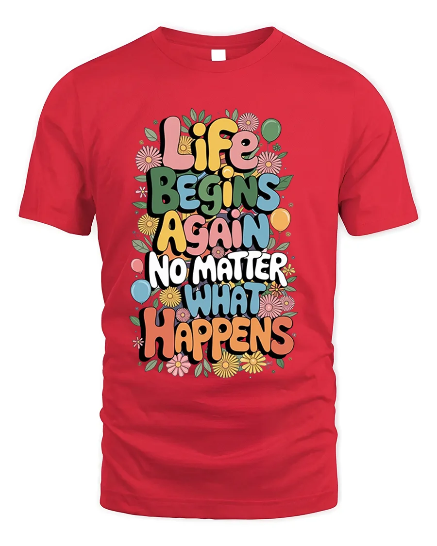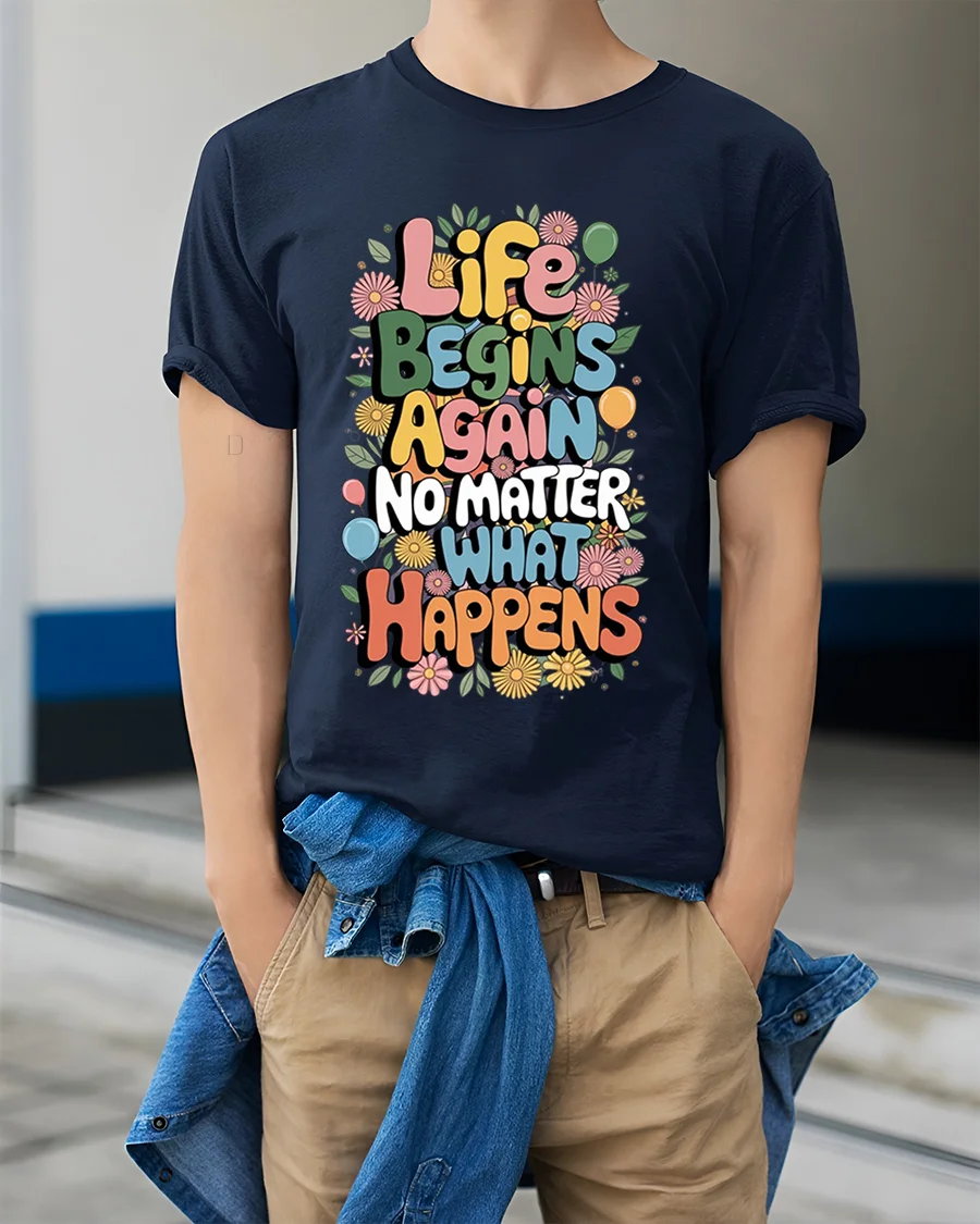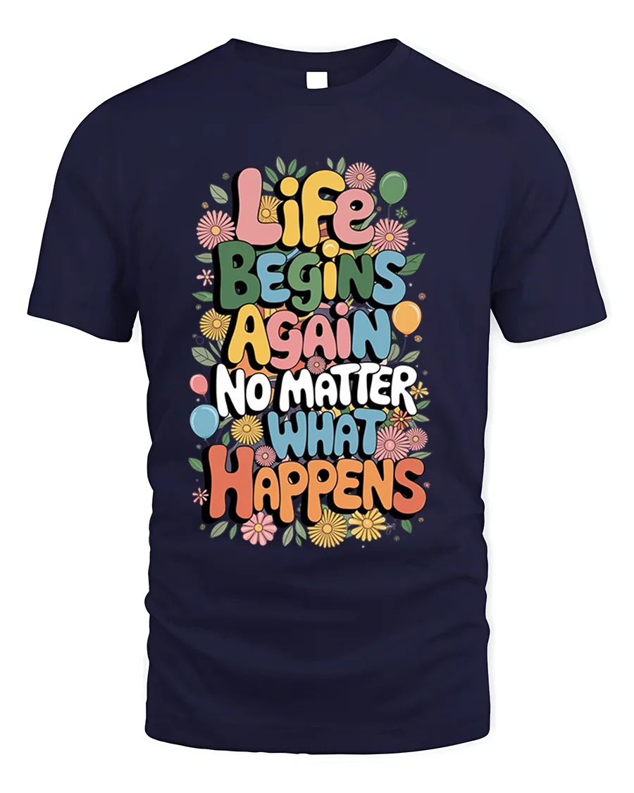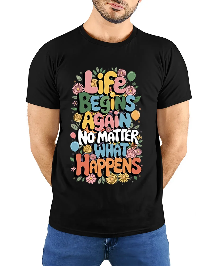 Let your outfit reflect your mindset with the Life Begins Again Positive Quote Graphic T-Shirt—a perfect choice for those who believe in new beginnings, no matter what happens. Wear it proudly as a symbol of hope, positivity, and inner strength, and share your bright spirit with the world through this beautiful, motivational design.