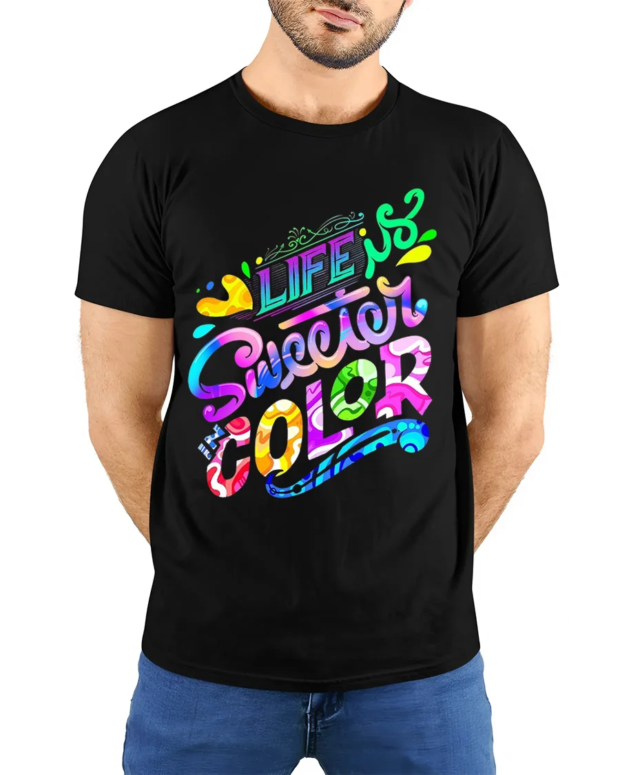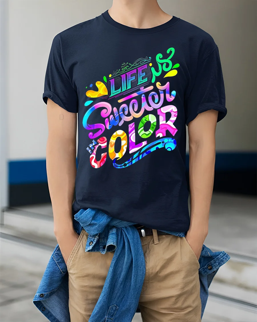 The Life Is Sweeter In Color Vibrant Typography T-Shirt is ideal for anyone who loves creative fashion and positive messages. Pair it easily with jeans, shorts, or layered under a casual jacket for a bright and modern streetwear look.