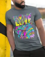 Designed with a vibrant graffiti-inspired font and artistic splashes of rainbow color, this tee sends a powerful message of hope, love, and unity.