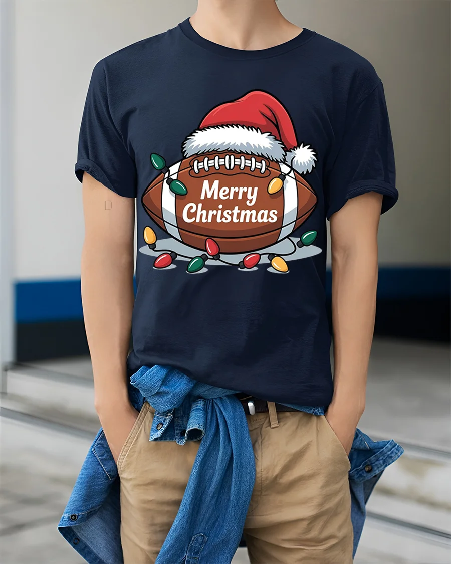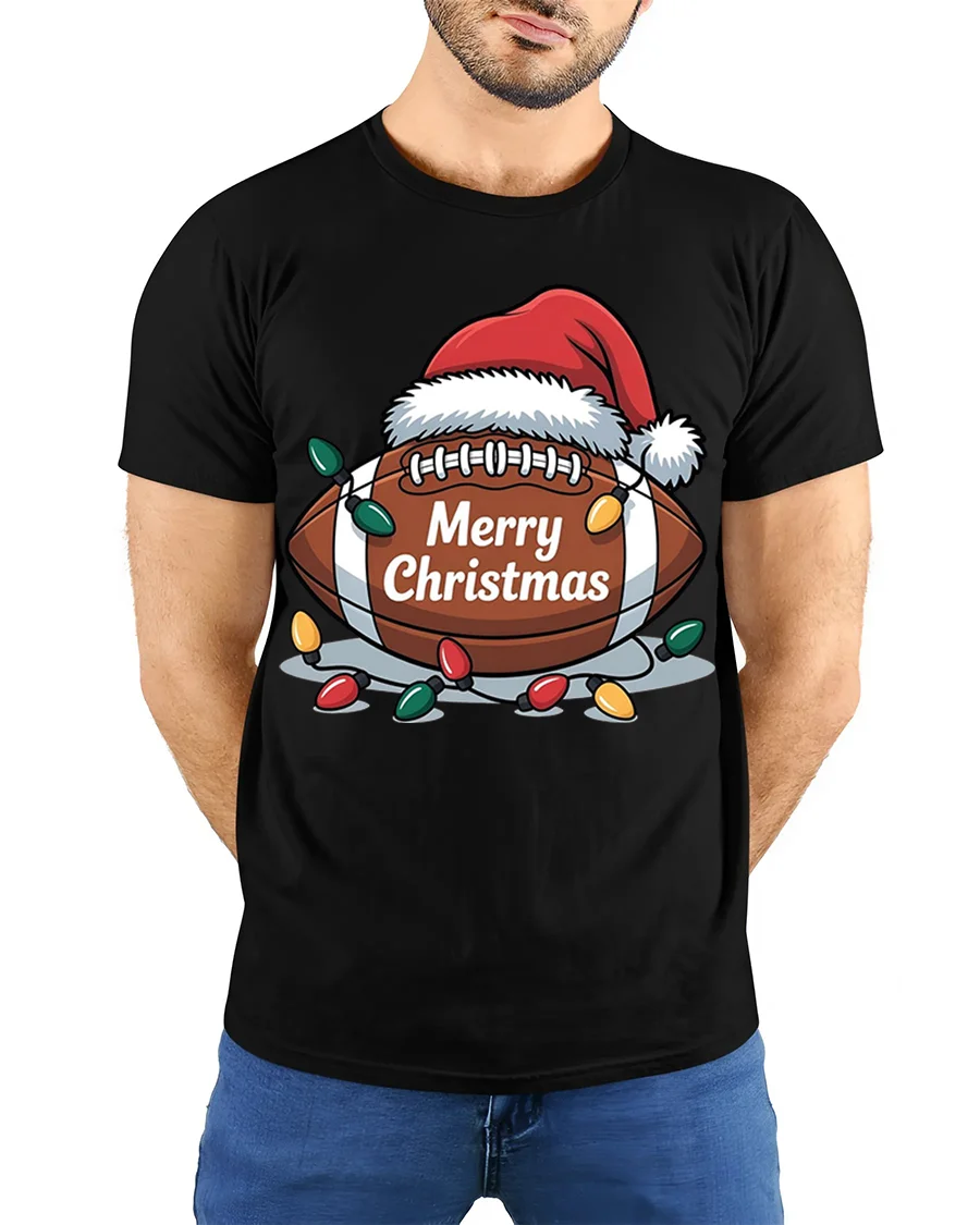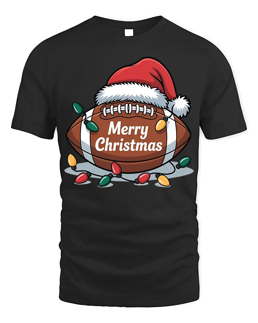 Merry Christmas Football Santa Hat Lights Holiday T-Shirt