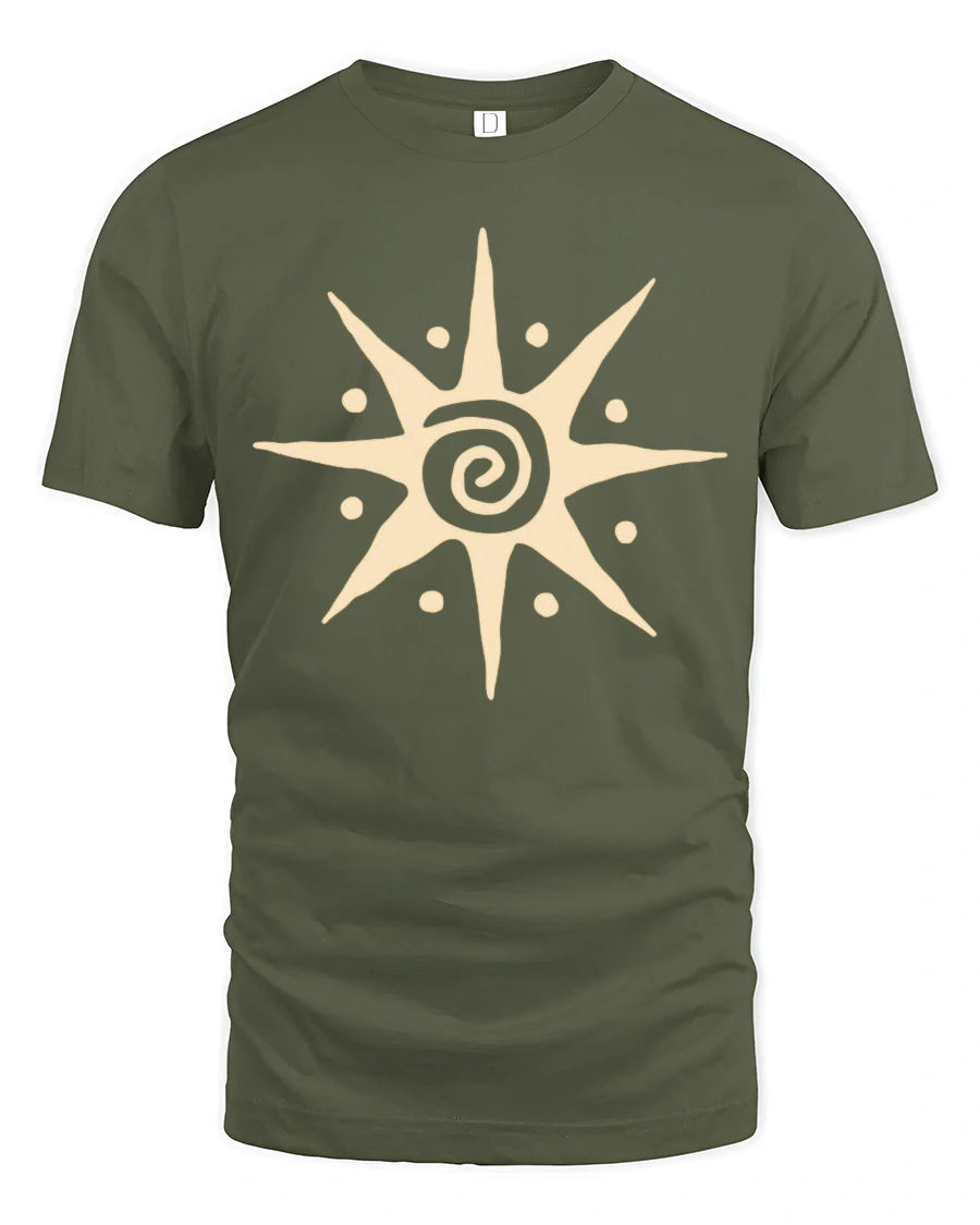 Minimalist Spiral Sun Symbol Graphic Tee Boho Aesthetic Vibe Tshirt - military green t-shirt on white background