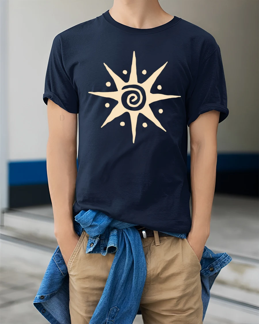 Minimalist Spiral Sun Symbol Graphic Tee Boho Aesthetic Vibe Tshirt - model wearing navy tee with hands in pockets