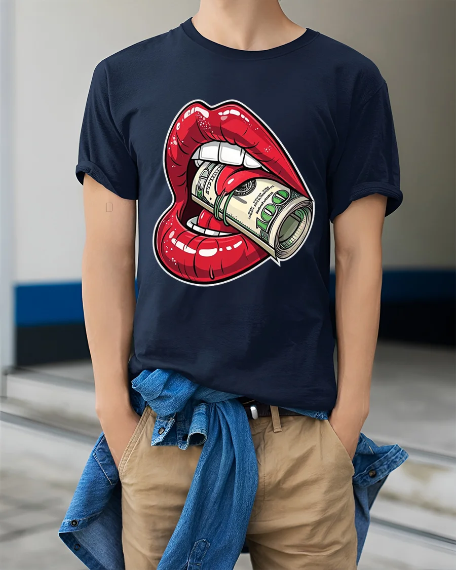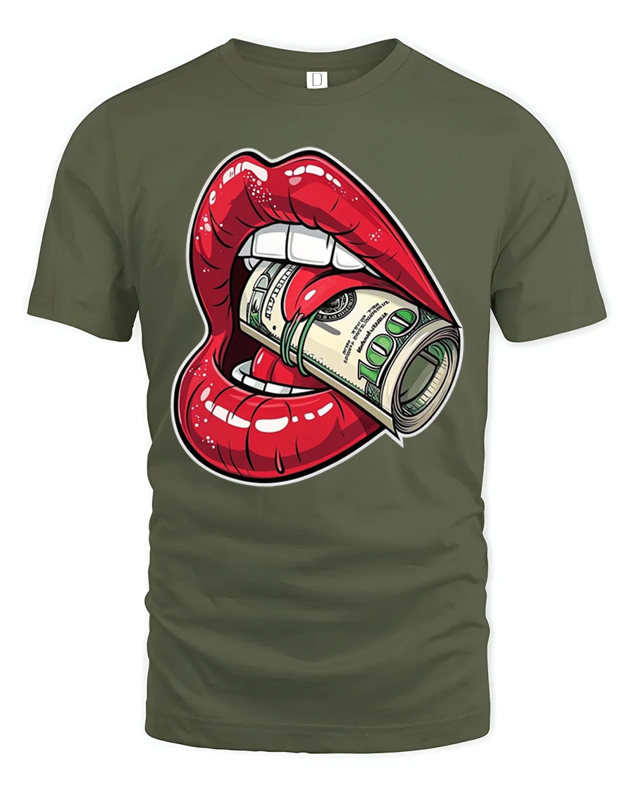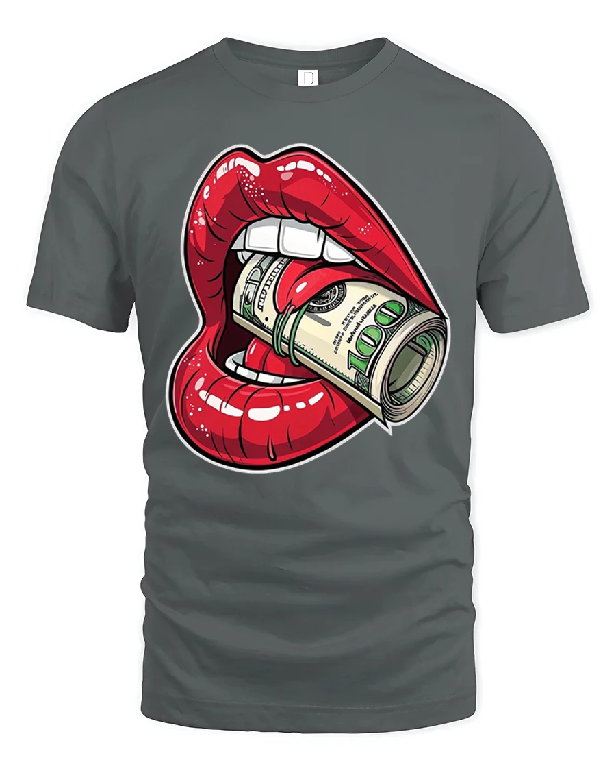 The graphic features bold red lips biting a roll of cash, creating a powerful visual that blends luxury attitude with playful rebellious art.