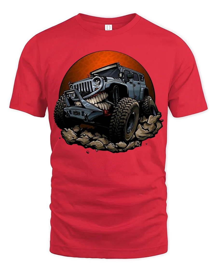 Monster Off Road Jeep Graphic T Shirt Rugged Adventure Style Tee - red t-shirt on white background