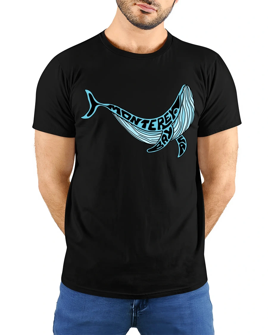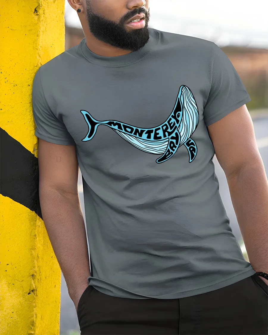 Monterey Bay Whale Ocean Coastal Travel Graphic Tee Tshirt captures the beauty of marine wildlife through a creative illustration inspired by the iconic coastal atmosphere of monterey bay.