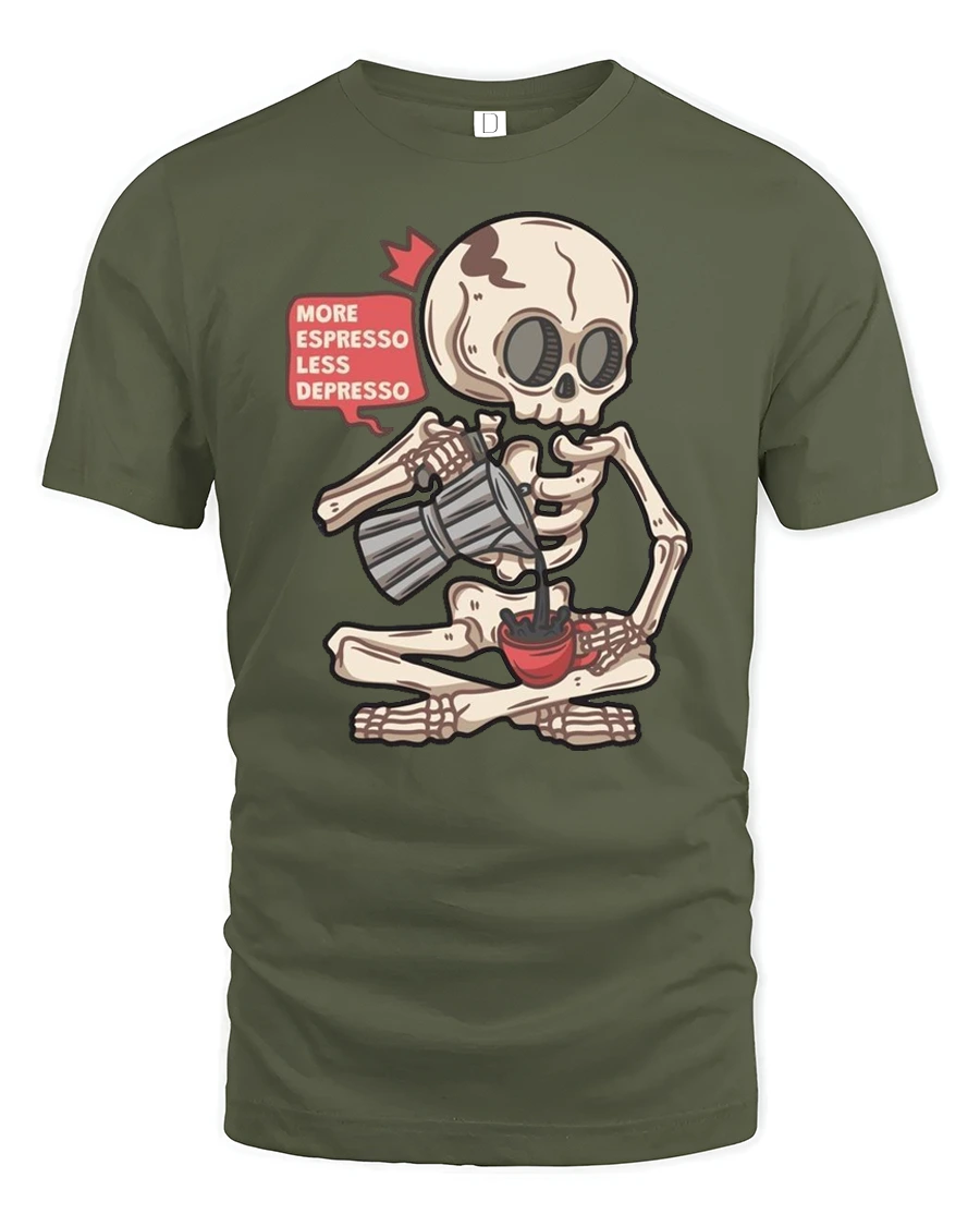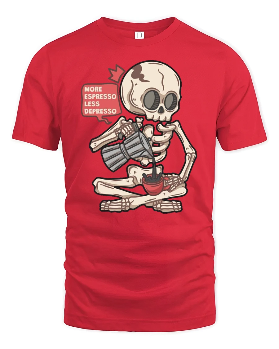 More Espresso Less Depresso Skeleton Coffee T Shirt Tee delivers a fun and relatable design that coffee lovers will instantly enjoy.