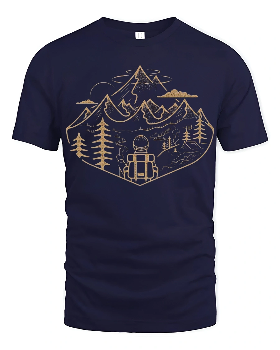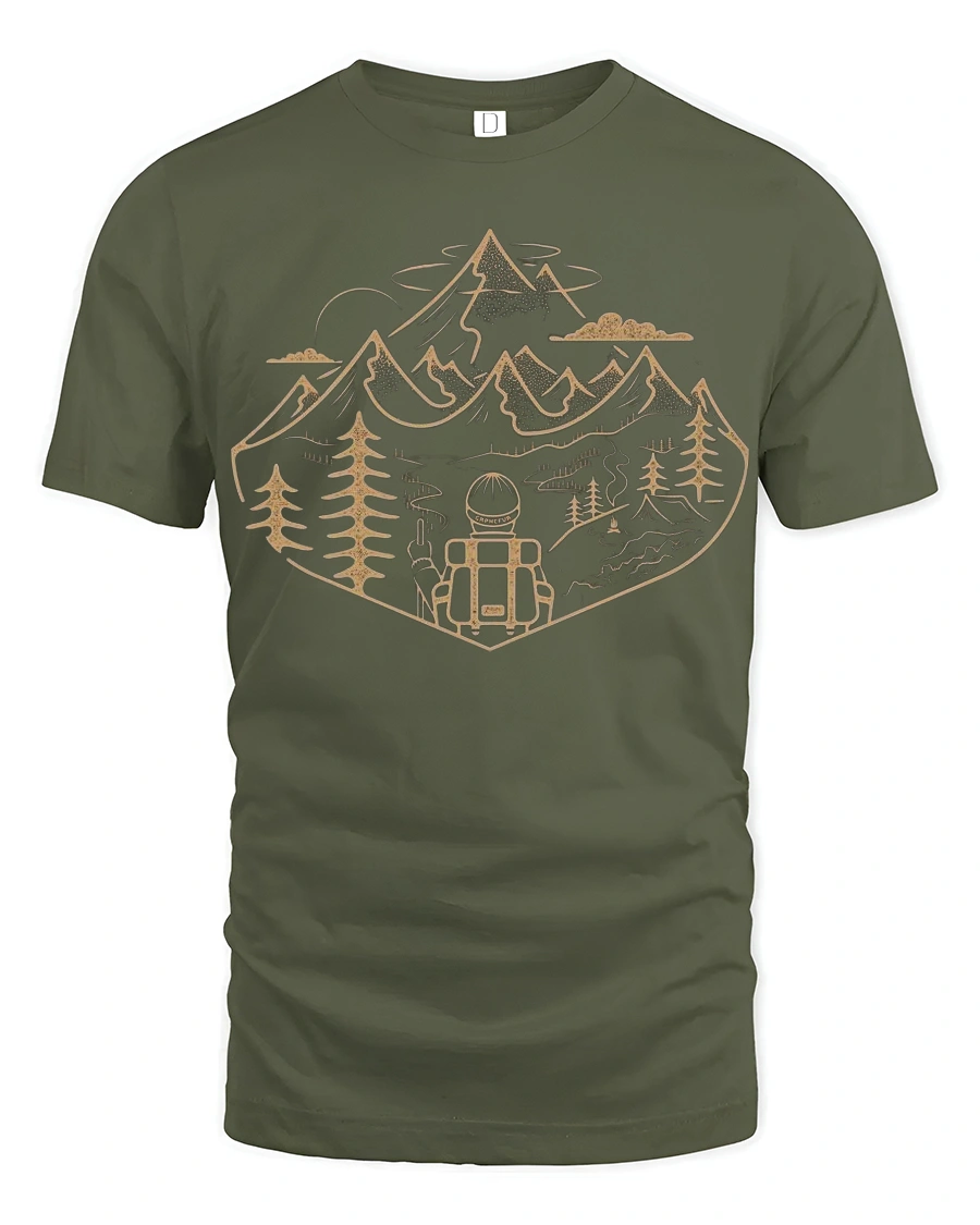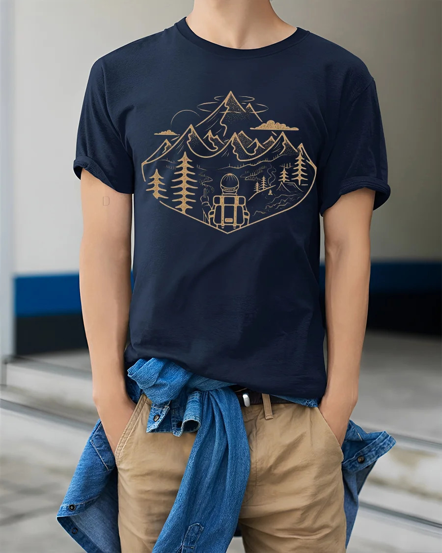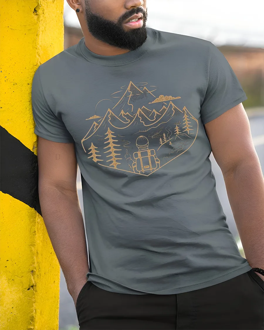 Featuring a scenic mountain landscape with trees, trails, and a lone backpacker, this tee reflects the spirit of adventure and discovery.