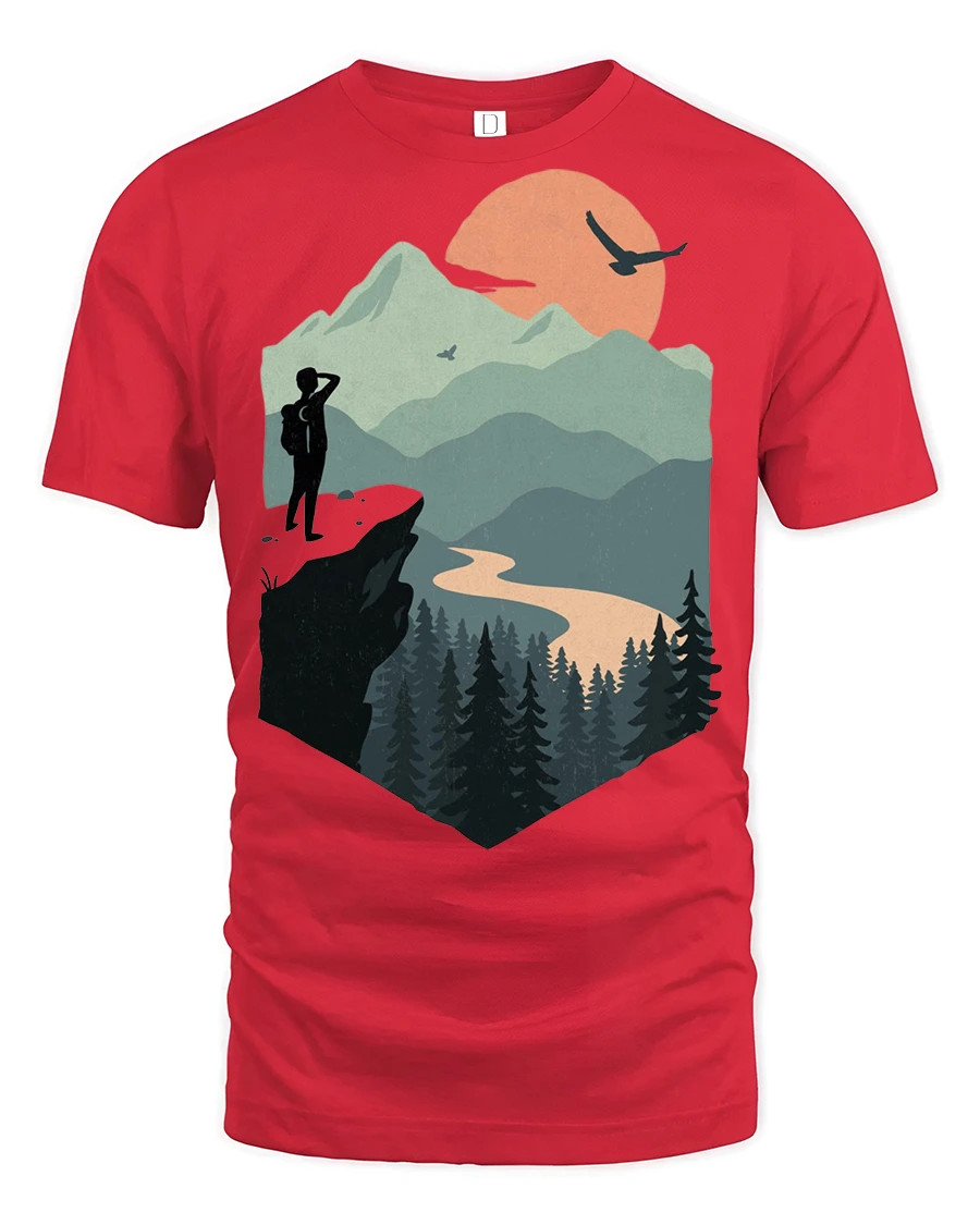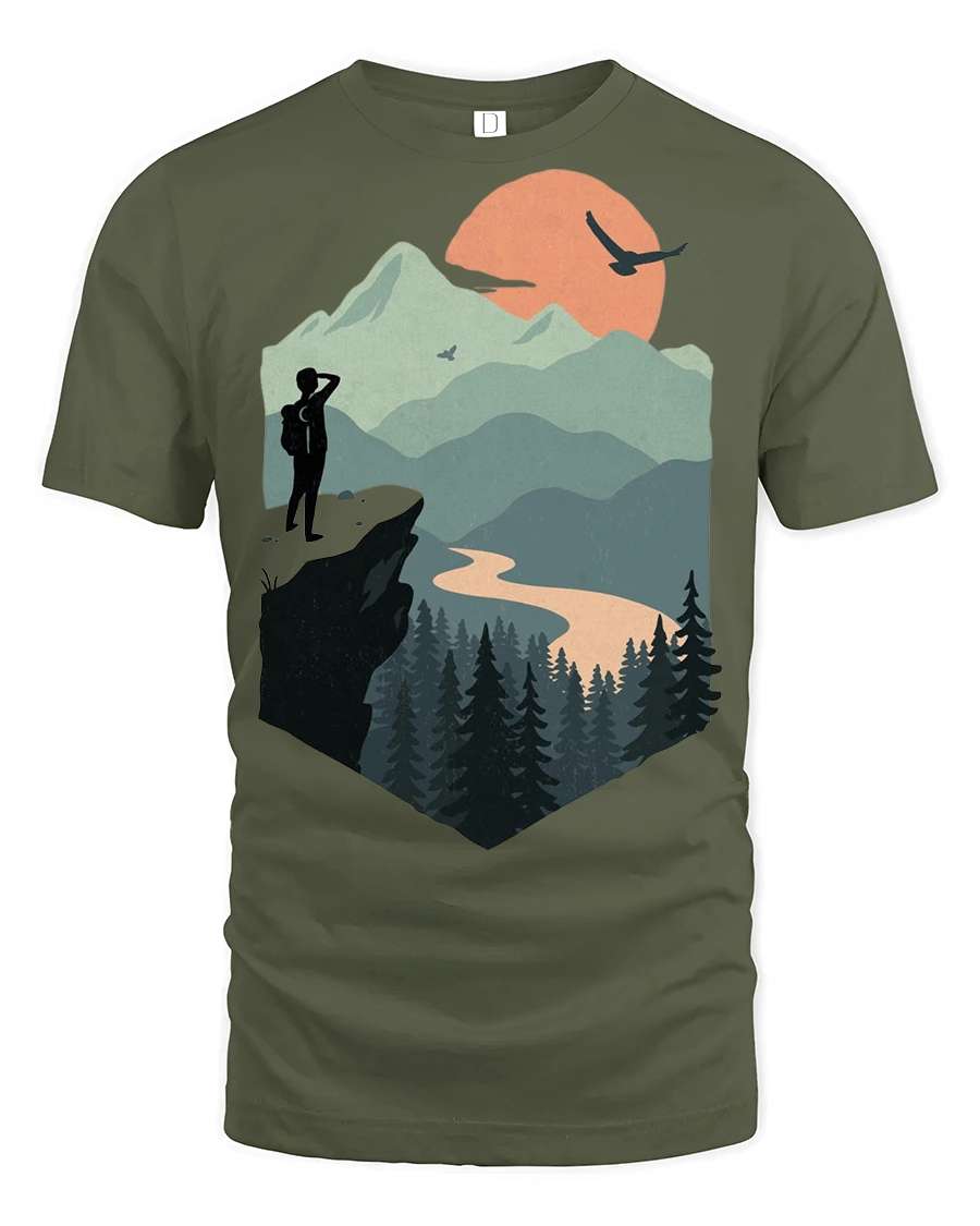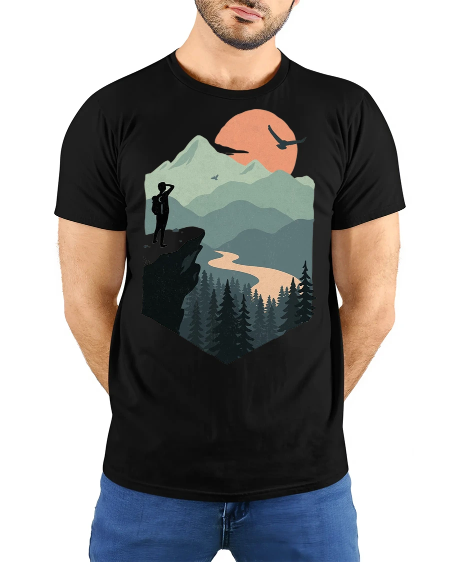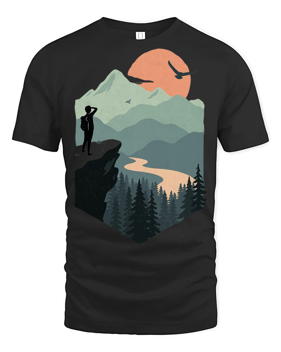 Featuring a silhouette of a hiker overlooking mountains, forest, and a winding river at sunset, this tee reflects the spirit of exploration and freedom.
