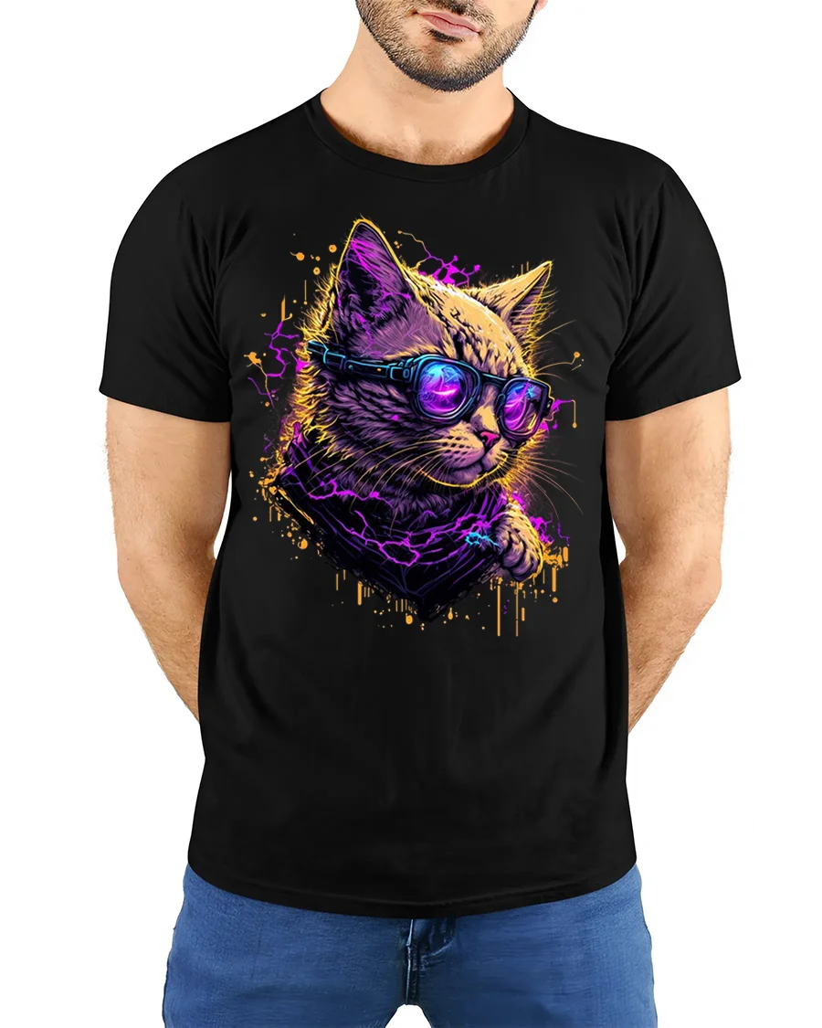 The Neon Cyberpunk Cool Cat Sunglasses Graphic T-Shirt also makes a fantastic gift for cat lovers, cyberpunk fans, or friends who enjoy bold and artistic designs. Add this one-of-a-kind piece to your collection and let your inner cool cat shine with a neon glow.