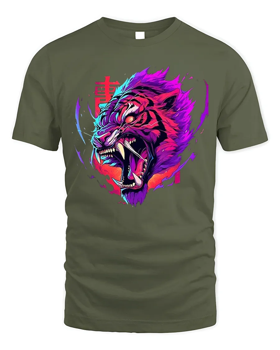 Neon Cyberpunk Tiger Fierce Attack Colorful Artwork Graphic T-Shirt brings unmatched intensity and futuristic style to your wardrobe. Featuring a roaring tiger with glowing neon fur in shades of purple, pink, and red, this design captures the fierce energy of cyberpunk art. The dynamic brush strokes and Japanese-style elements create a dramatic, high-impact visual that instantly stands out.