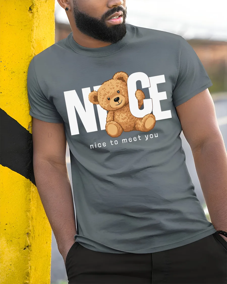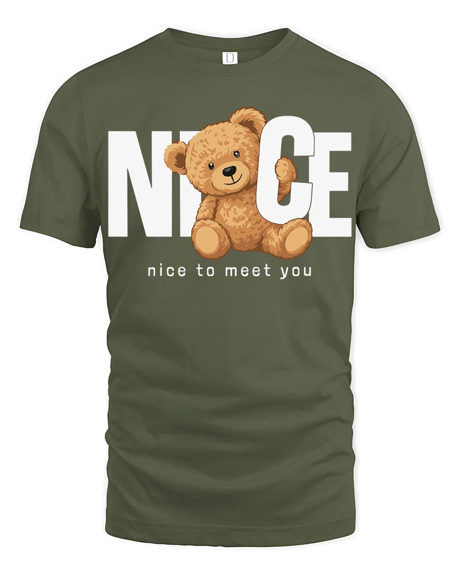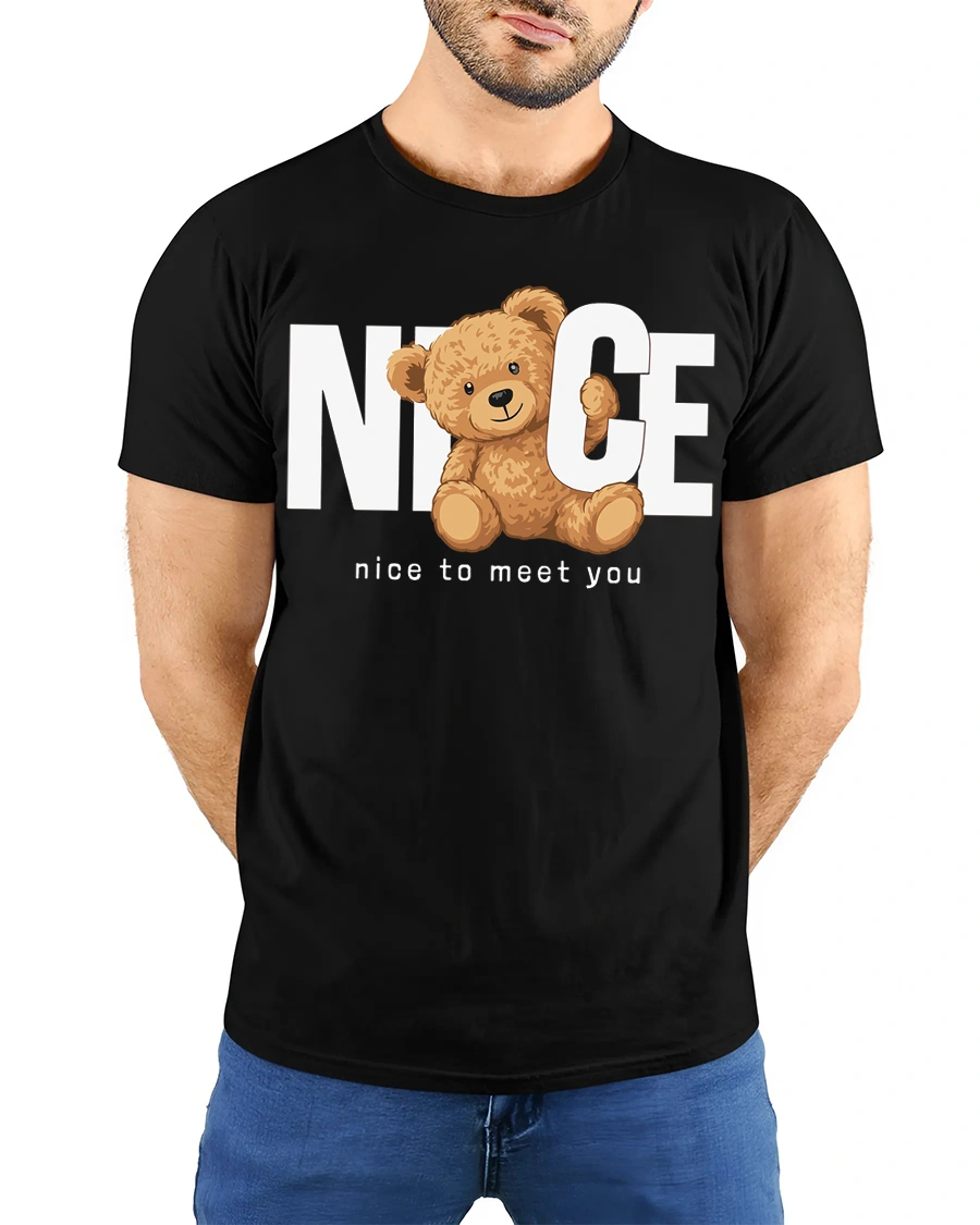 Nice To Meet You Cute Teddy Bear Graphic T Shirt Funny Friendly Tee brings a warm and charming vibe with its adorable teddy bear design and welcoming message.