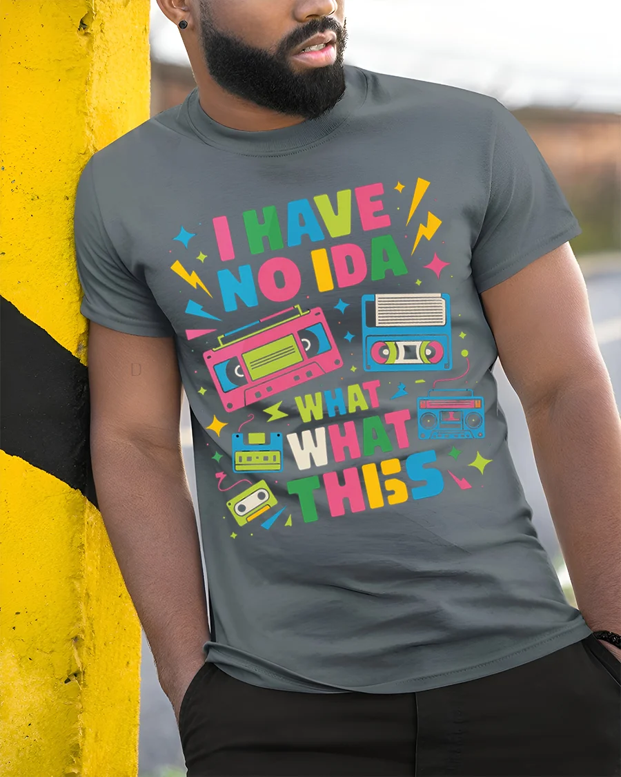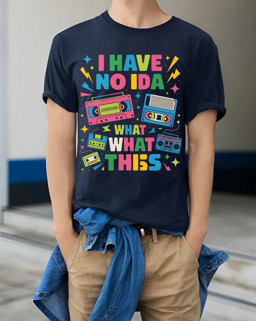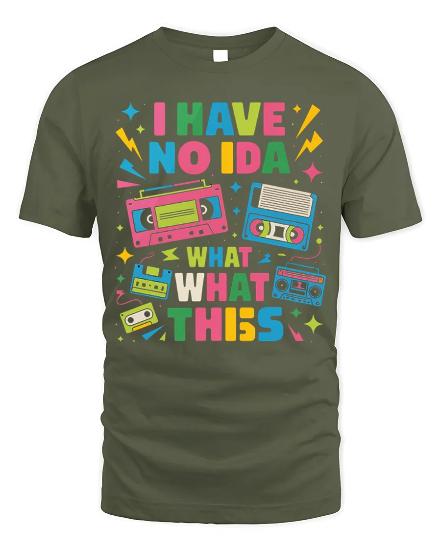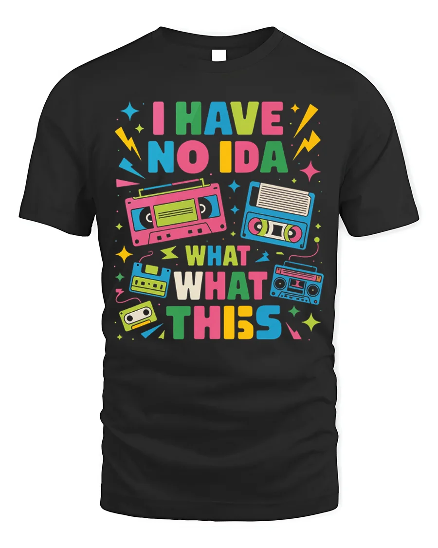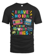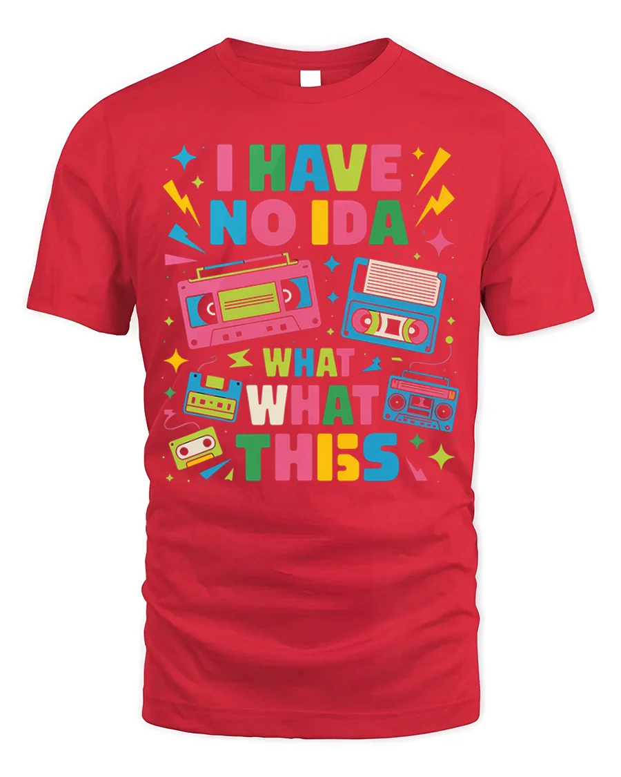 No Idea Retro Cassette Funny Vintage Throwback Graphic T-Shirt is the perfect blend of humor and nostalgic charm. Featuring brightly colored cassette tapes, retro radios, and a playful bold quote, this design humorously pokes fun at the classic tech that many younger generations may not recognize. The vibrant pop-art color palette brings fun energy and a true throwback vibe to the design.