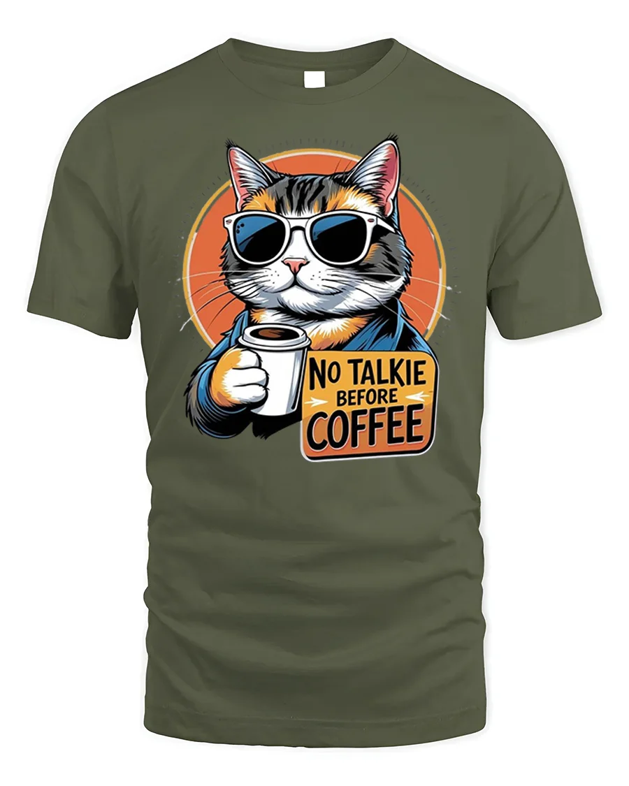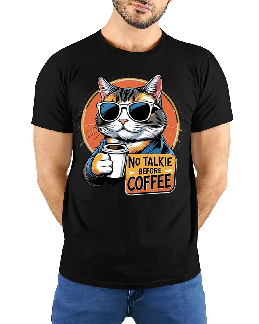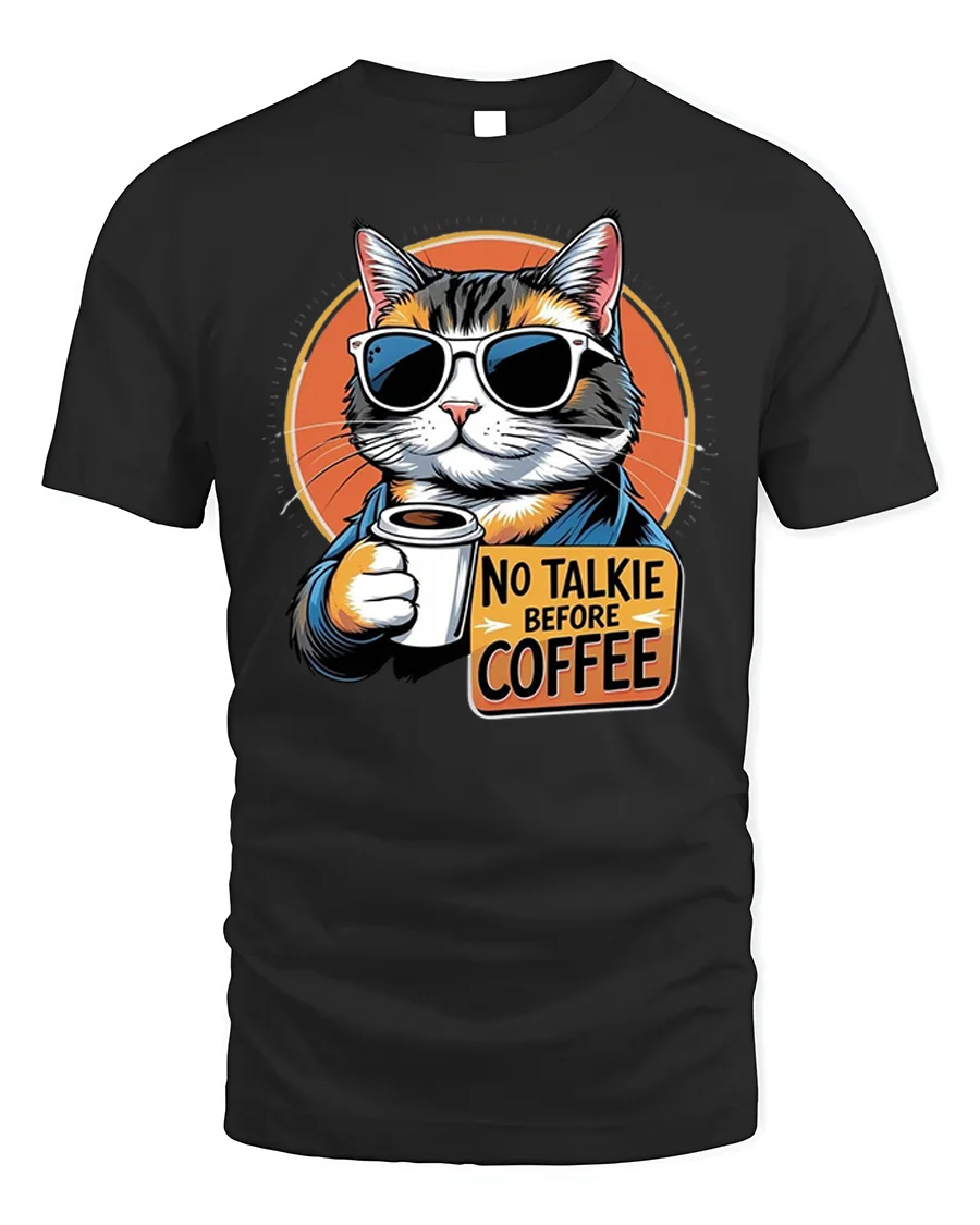 No Talkie Before Coffee Cat Funny Graphic Tshirt is the perfect choice for coffee lovers and cat enthusiasts who appreciate humor and sarcasm. This stylish t-shirt features a cool cat wearing sunglasses and holding a coffee cup with the bold message “No Talkie Before Coffee,” making it a funny and relatable design for everyday wear.