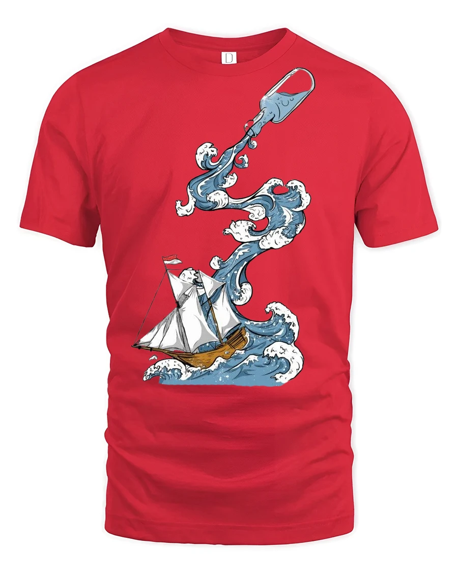 The imaginative design blends a classic sailing ship with powerful waves forming an artistic maritime visual story.