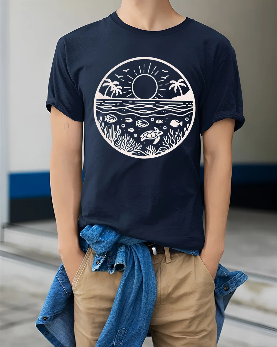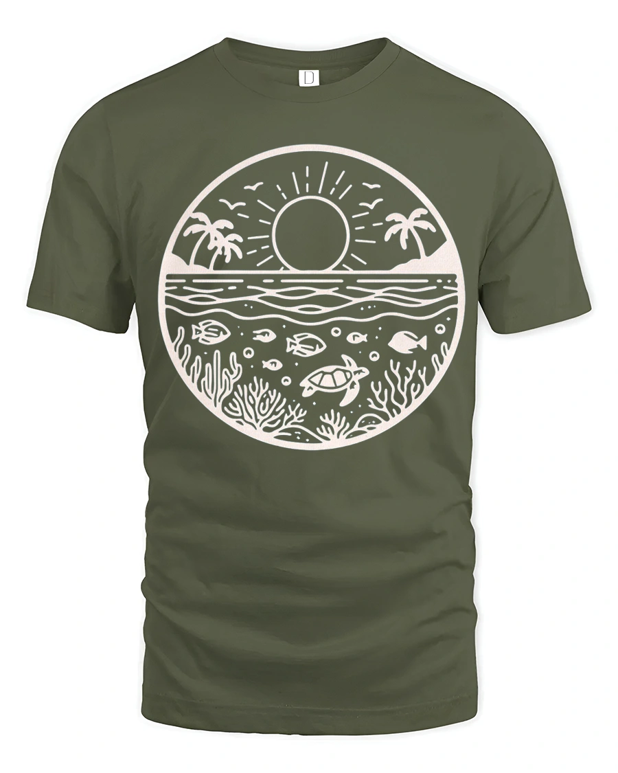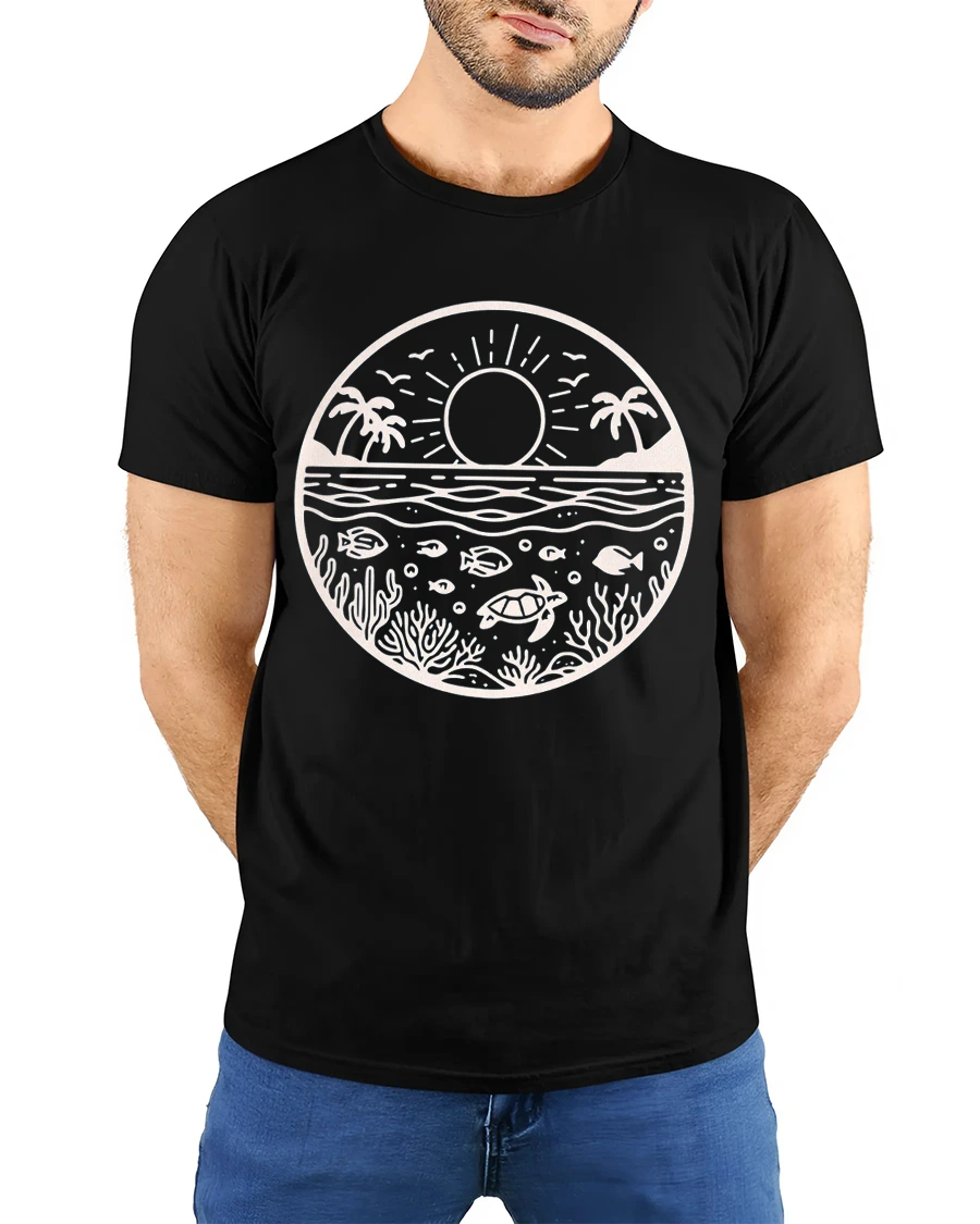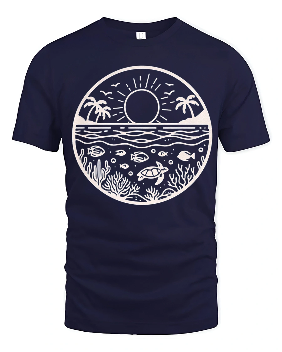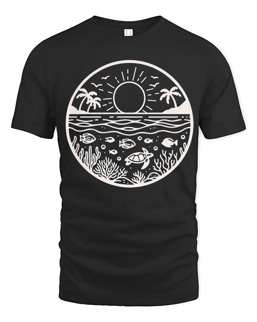 Ocean Sunset Marine Life Graphic Tee Coastal Nature Style beautifully captures the harmony between peaceful sunset skies and vibrant underwater life.