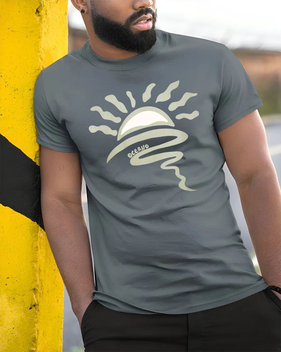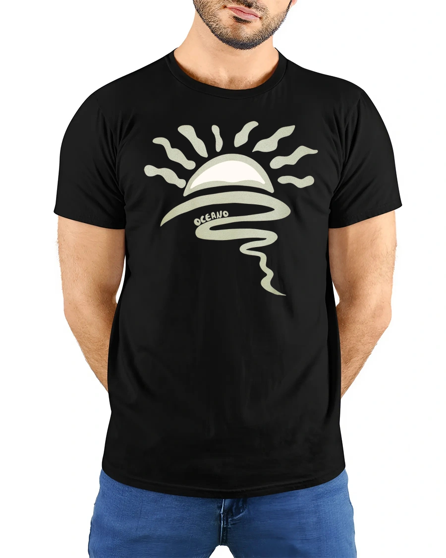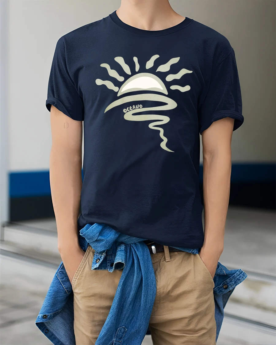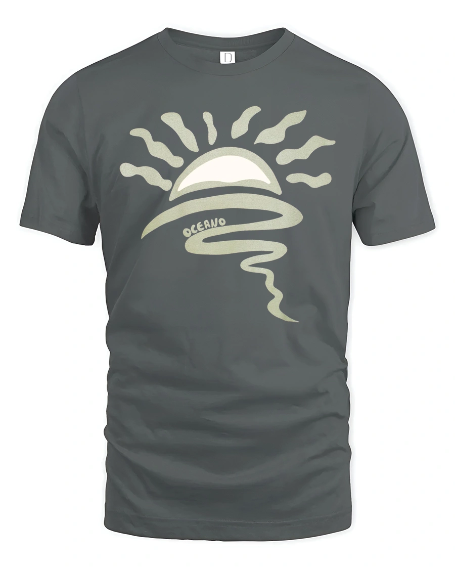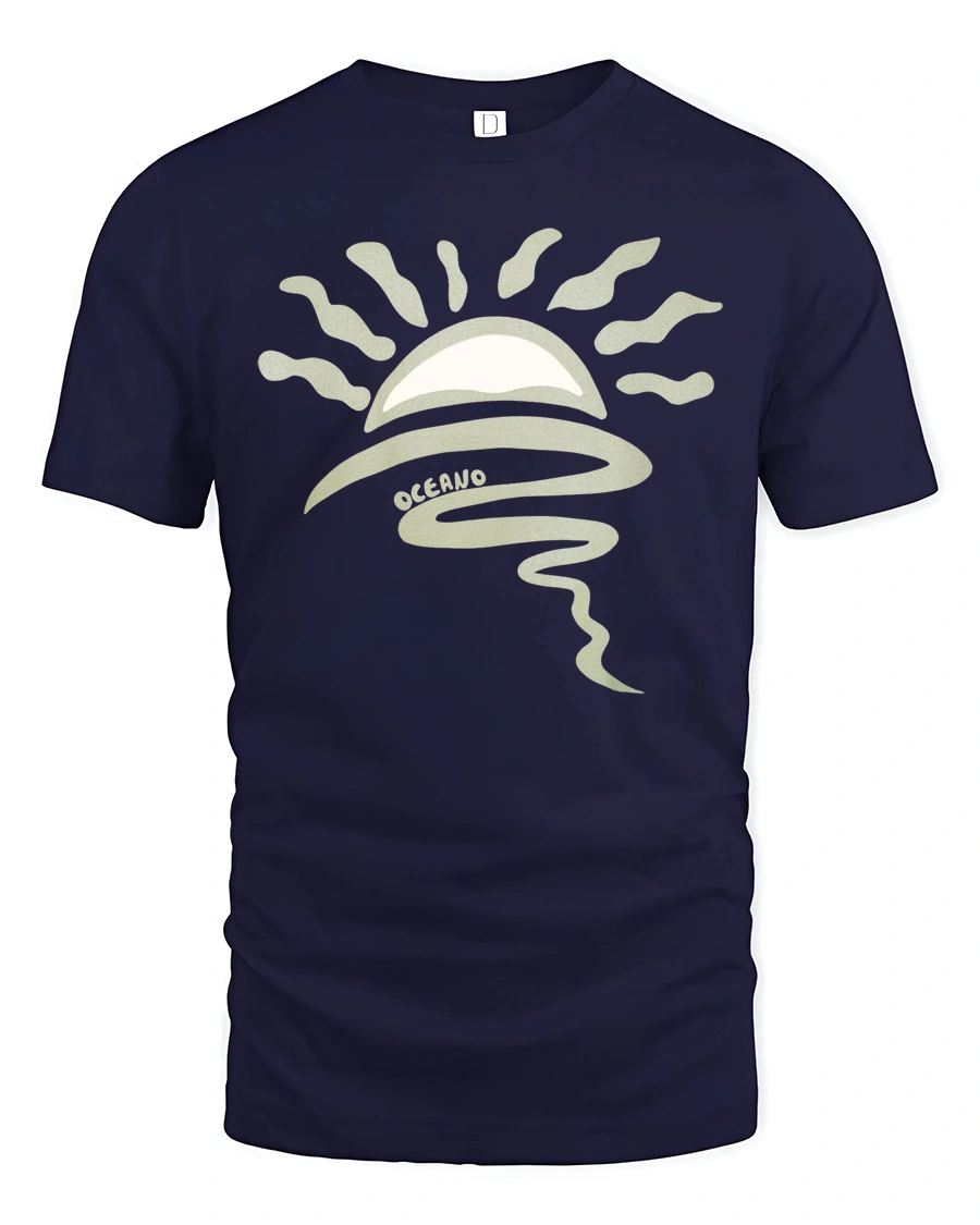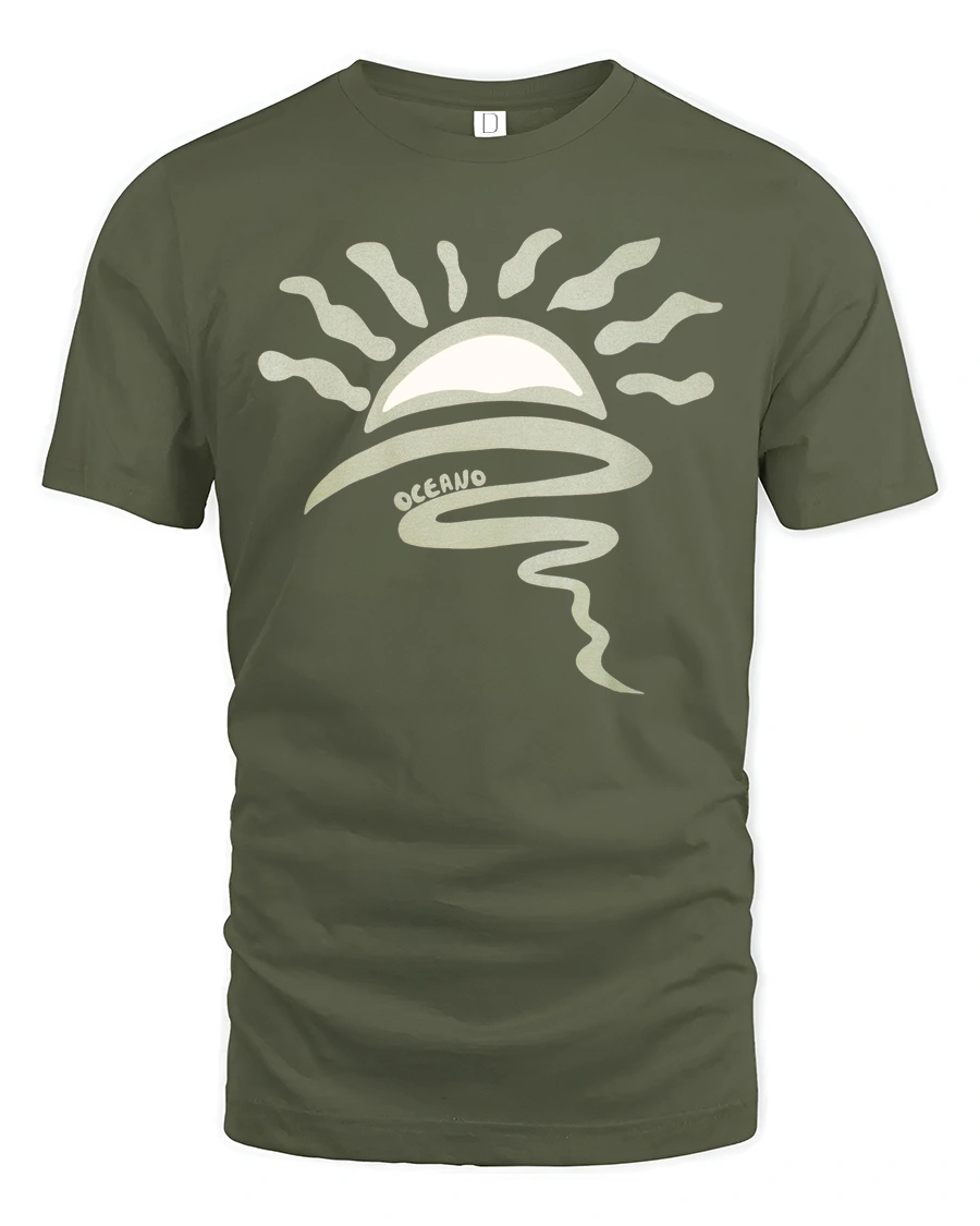 Oceano Sunrise Wave Minimalist Beach Vibe Adventure Tee Aesthetic Tshirt captures the calm beauty of the ocean meeting the rising sun.