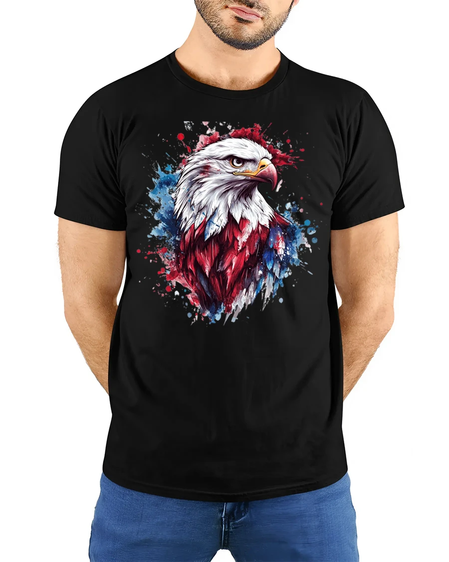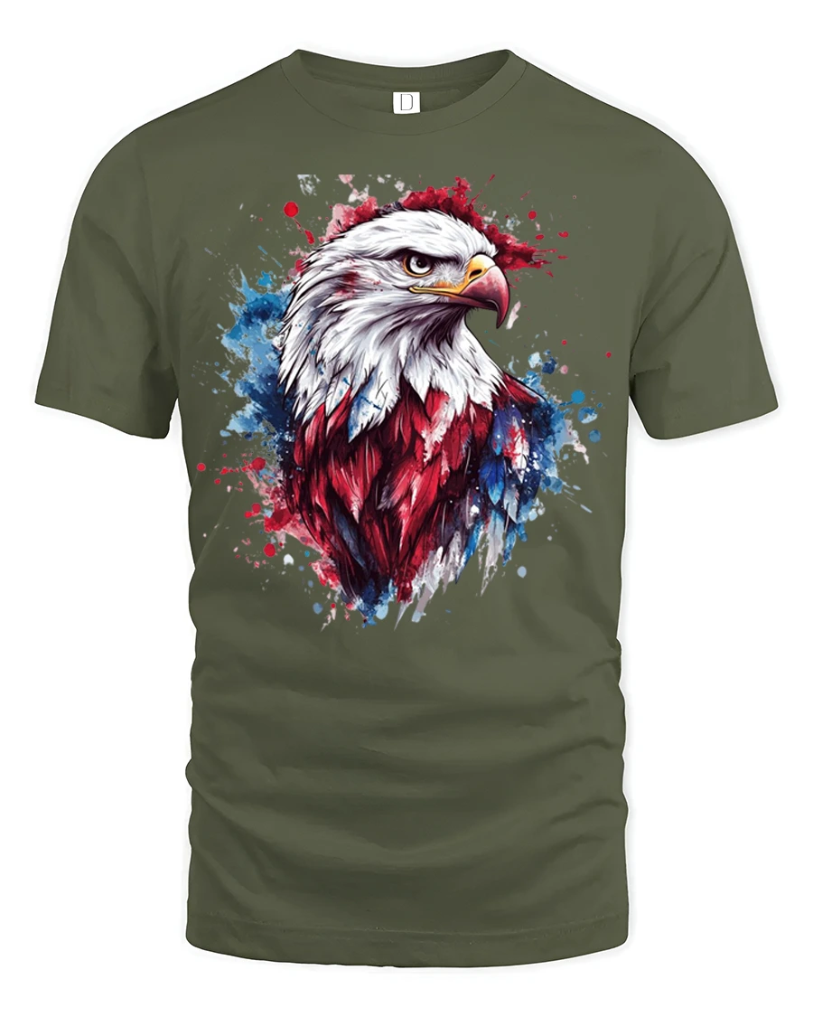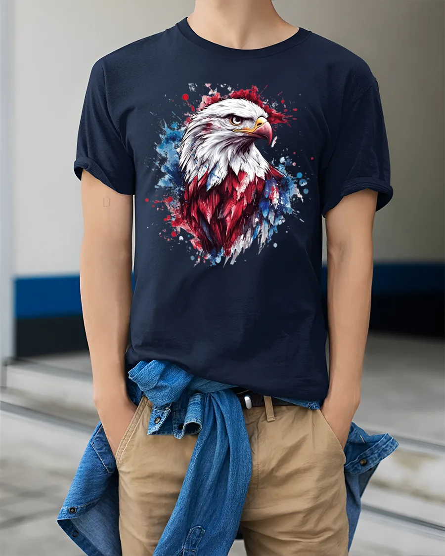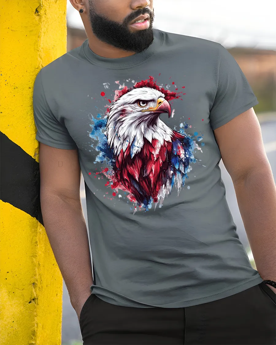 Soft comfortable fabric provides a relaxed everyday feel while the vibrant eagle artwork keeps the design bold and eye catching. The detailed feathers and dynamic paint splash effect add depth and artistic character that reflects American pride and independence. This patriotic eagle graphic tee blends classic national symbolism with modern art style, creating a meaningful and visually impressive shirt that celebrates strength freedom and American spirit.