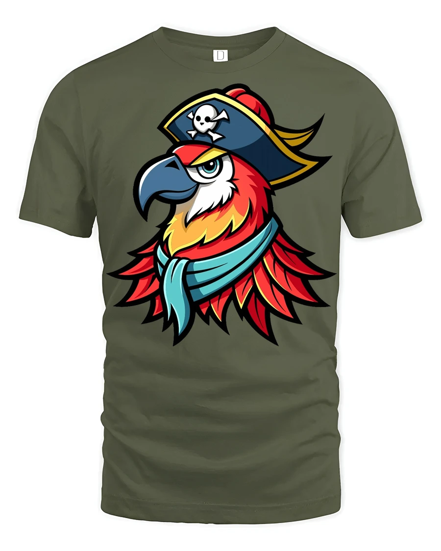 Pirate Parrot Captain Graphic T Shirt Colorful Bird Adventure Tee - military green t-shirt on white background