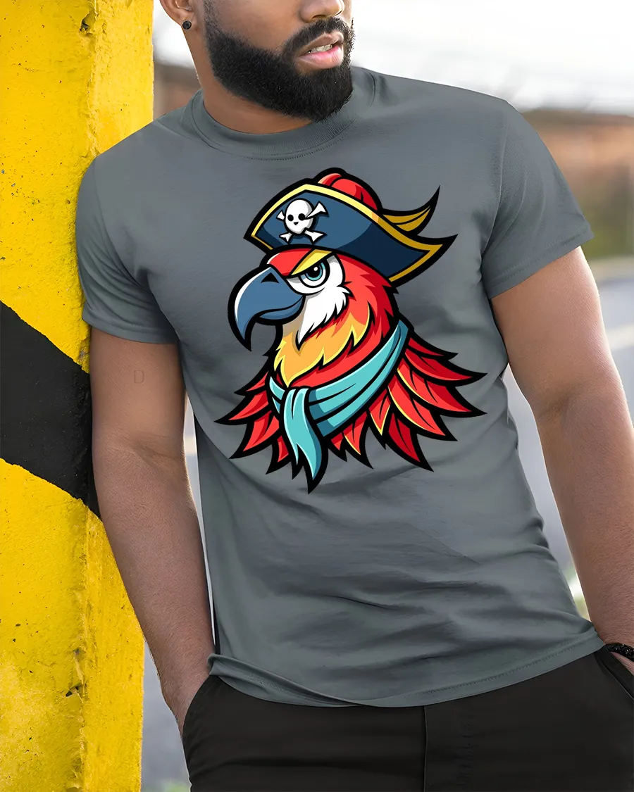 Pirate Parrot Captain Graphic T Shirt Colorful Bird Adventure Tee - model wearing grey tee, leaning on column