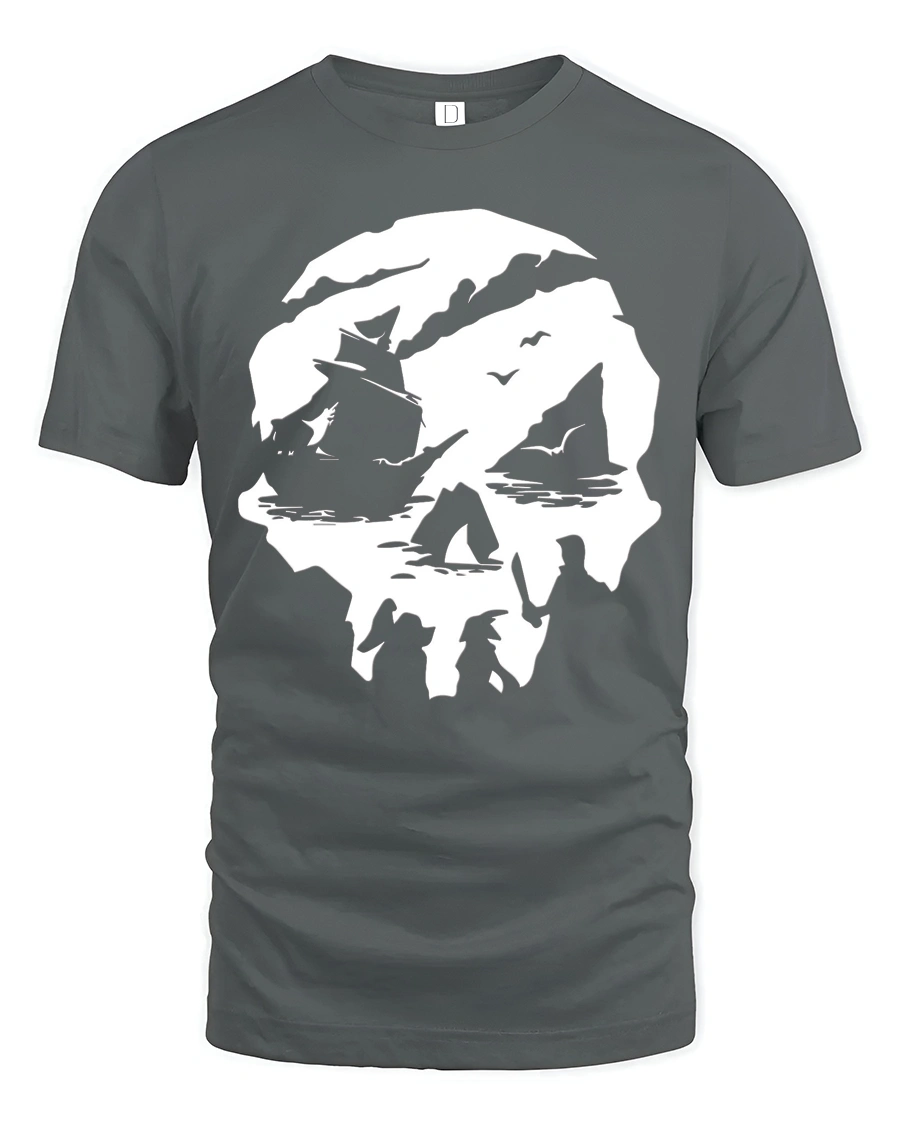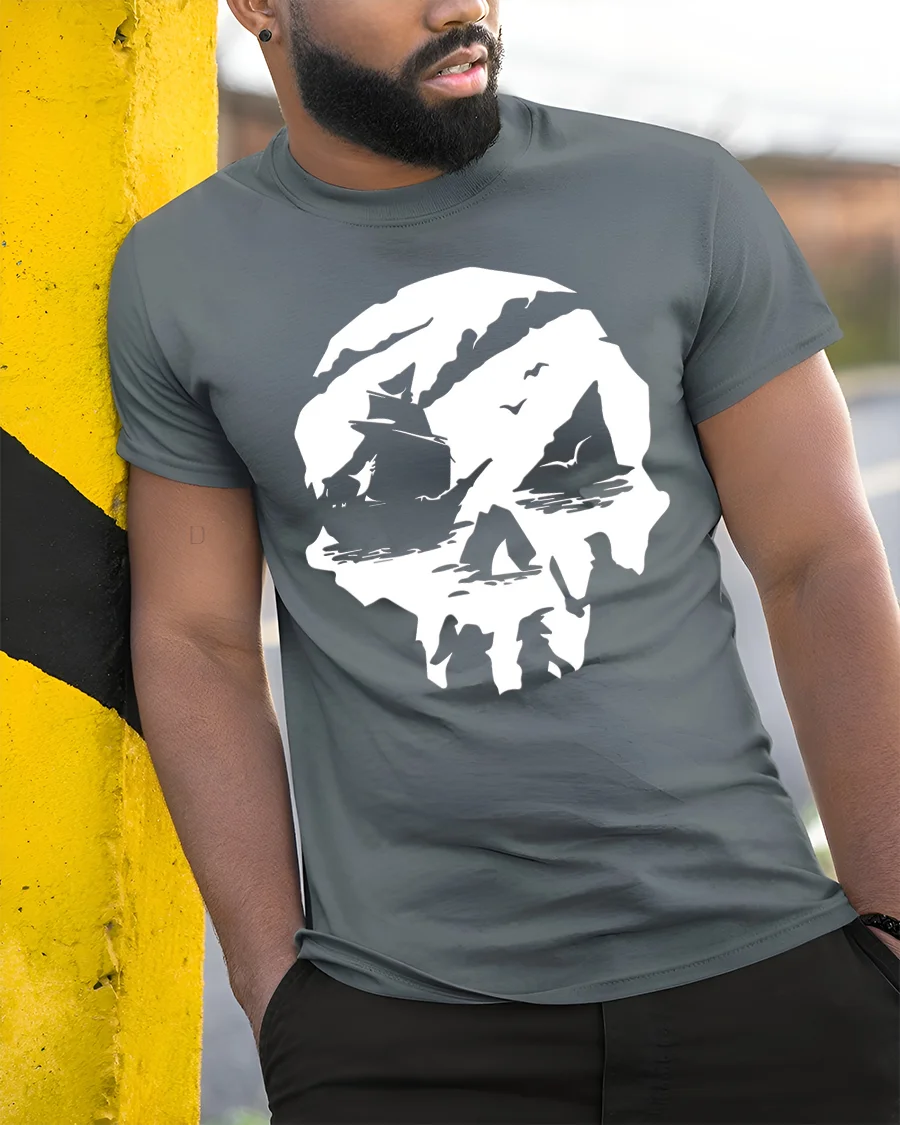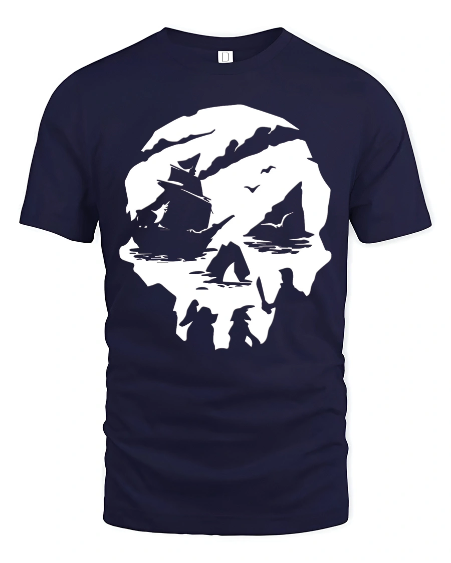 This nautical inspired tshirt offers a distinctive graphic concept that celebrates exploration and creative imagination. The bold skull silhouette paired with ocean scenery provides a memorable visual that stands out in casual fashion. A stylish graphic tee that reflects adventurous personality, artistic depth, and appreciation for classic maritime themes.