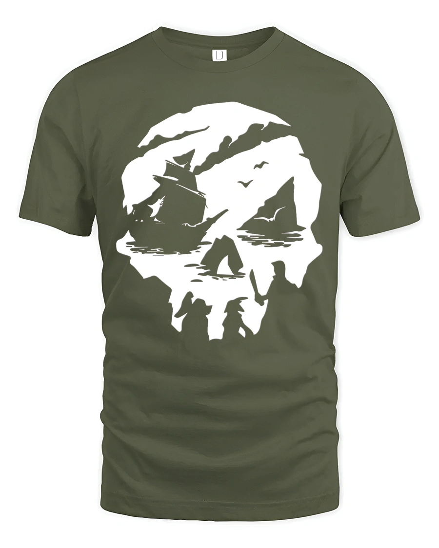 Pirate Skull Ship Graphic Tee Adventure Ocean Style Tshirt blends bold nautical symbolism with imaginative artistic expression. The unique skull silhouette filled with sailing ship scenery creates a visually striking design that represents freedom, exploration, and adventurous spirit. This creative composition combines vintage maritime inspiration with modern graphic styling, delivering a powerful visual identity that feels both timeless and expressive.