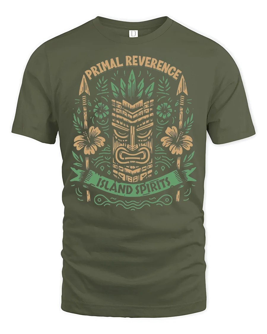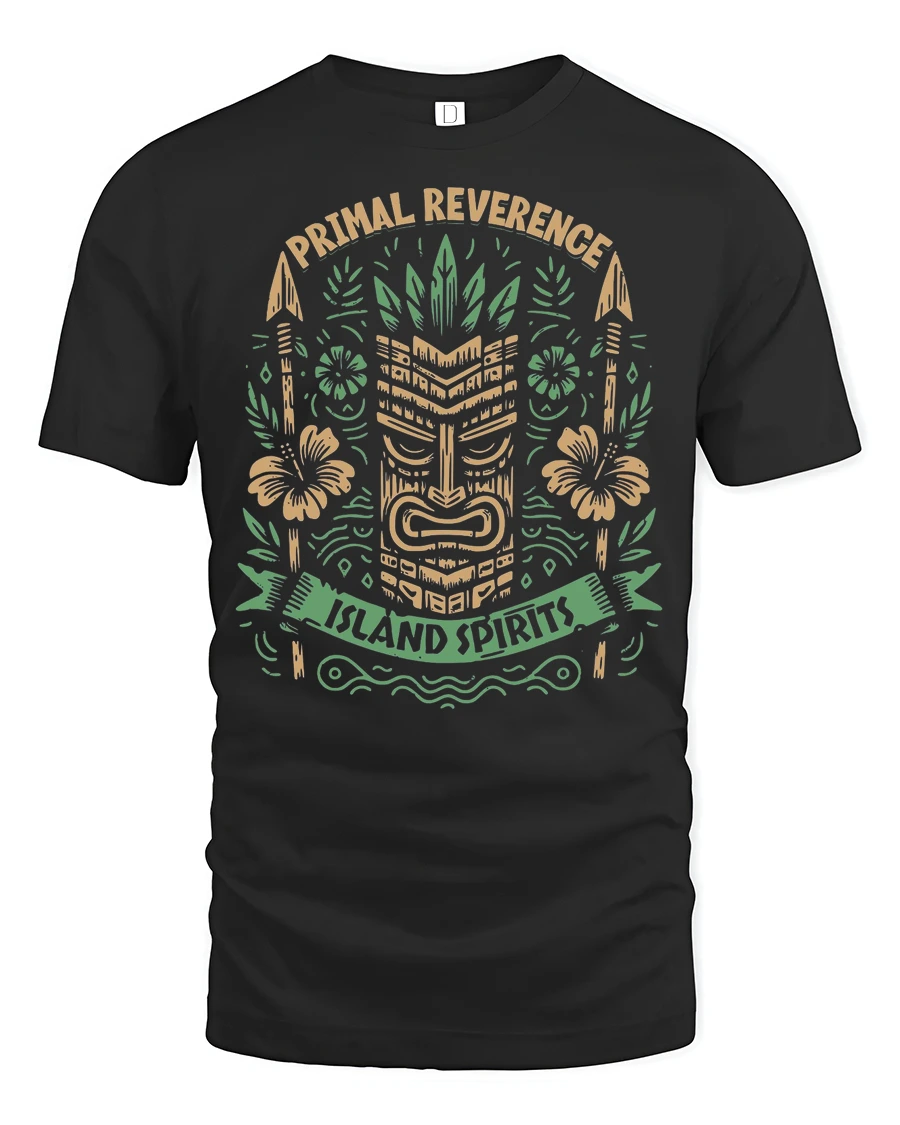 Primal Reverence Island Spirits Tiki Graphic T Shirt Tee showcases a bold and artistic design inspired by tropical island culture.