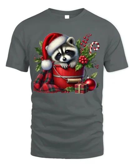 Cute Raccoon Santa Hat Christmas Candy Cane Holiday Tshirt