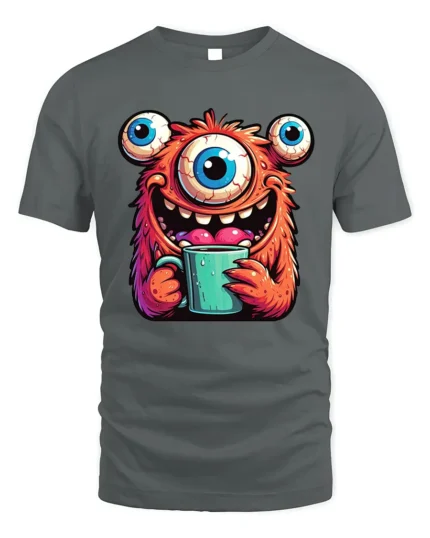 Funny Monster With Coffee Cartoon Art Graphic T-Shirt