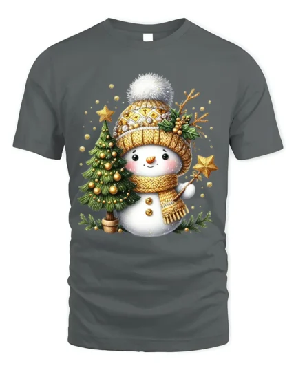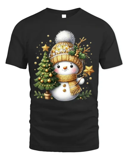 Cute Snowman and Christmas Tree Golden Winter T-Shirt