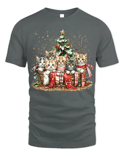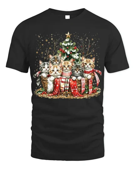 Cute Christmas Kittens T-Shirt with Holiday Basket and Tree Art