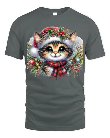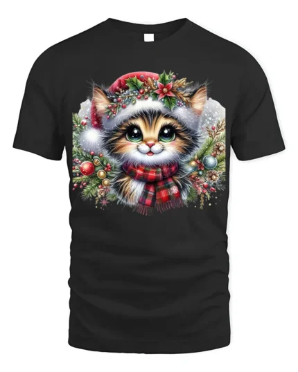 Festive Christmas Kitten T-Shirt with Holiday Scarf and Ornaments