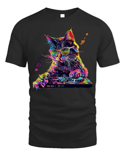 Colorful DJ Cat Neon Music Party Graphic T-Shirt