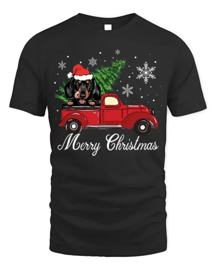 Cute Dachshund Dog Red Truck Merry Christmas T-Shirt