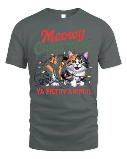 Funny Meowy Christmas Cat T-Shirt with Holiday Lights Design