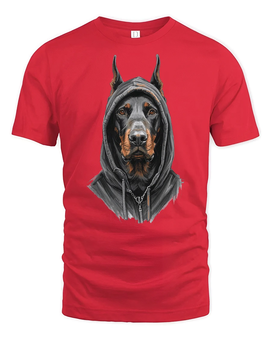 Doberman In Hoodie Graphic T Shirt Street Style Tee - red t-shirt on white background