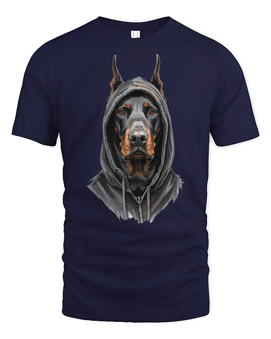 Doberman In Hoodie Graphic T Shirt Street Style Tee - navy t-shirt on white background