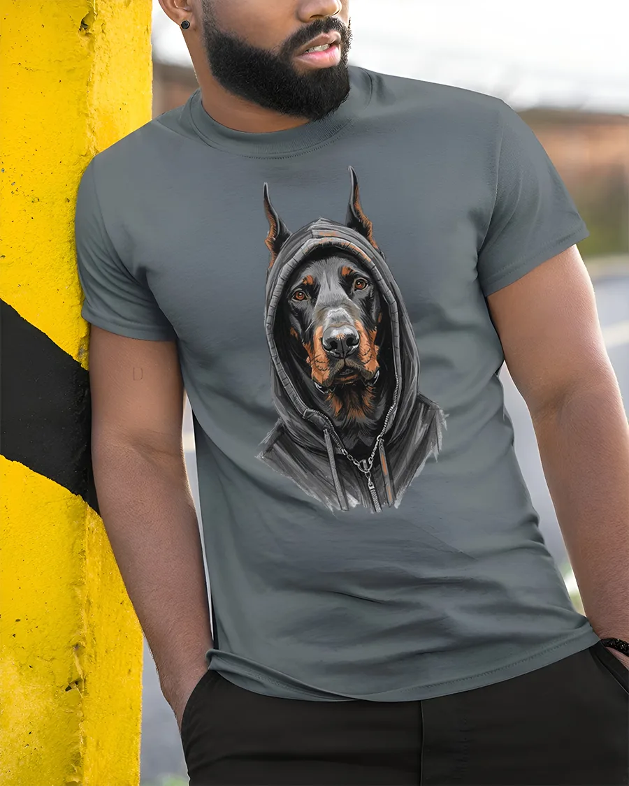 Doberman In Hoodie Graphic T Shirt Street Style Tee blends strength and modern fashion in a bold eye catching design. Featuring a detailed Doberman portrait wearing a sleek hoodie, this artwork captures the intelligent and fearless spirit of the breed with a contemporary urban twist. The realistic illustration highlights the sharp features and confident expression that make the Doberman so admired.