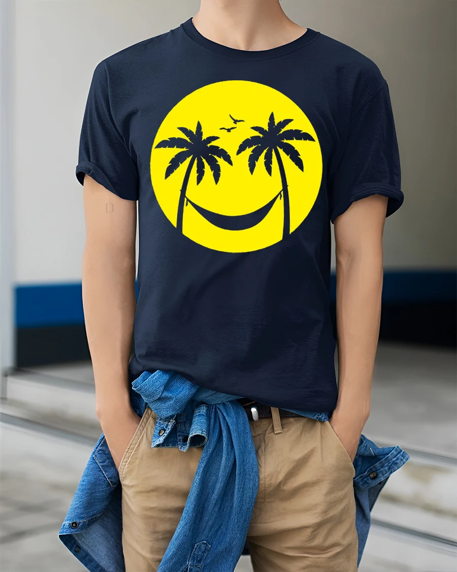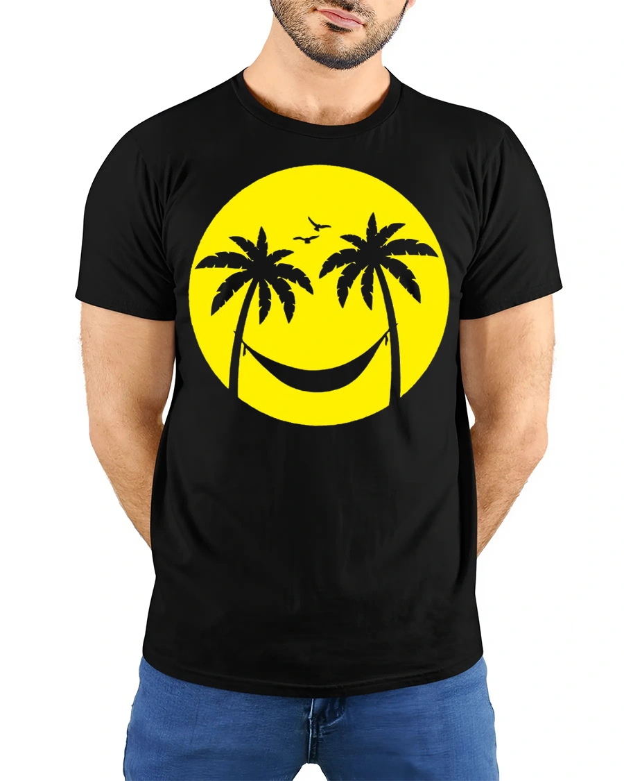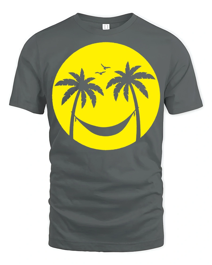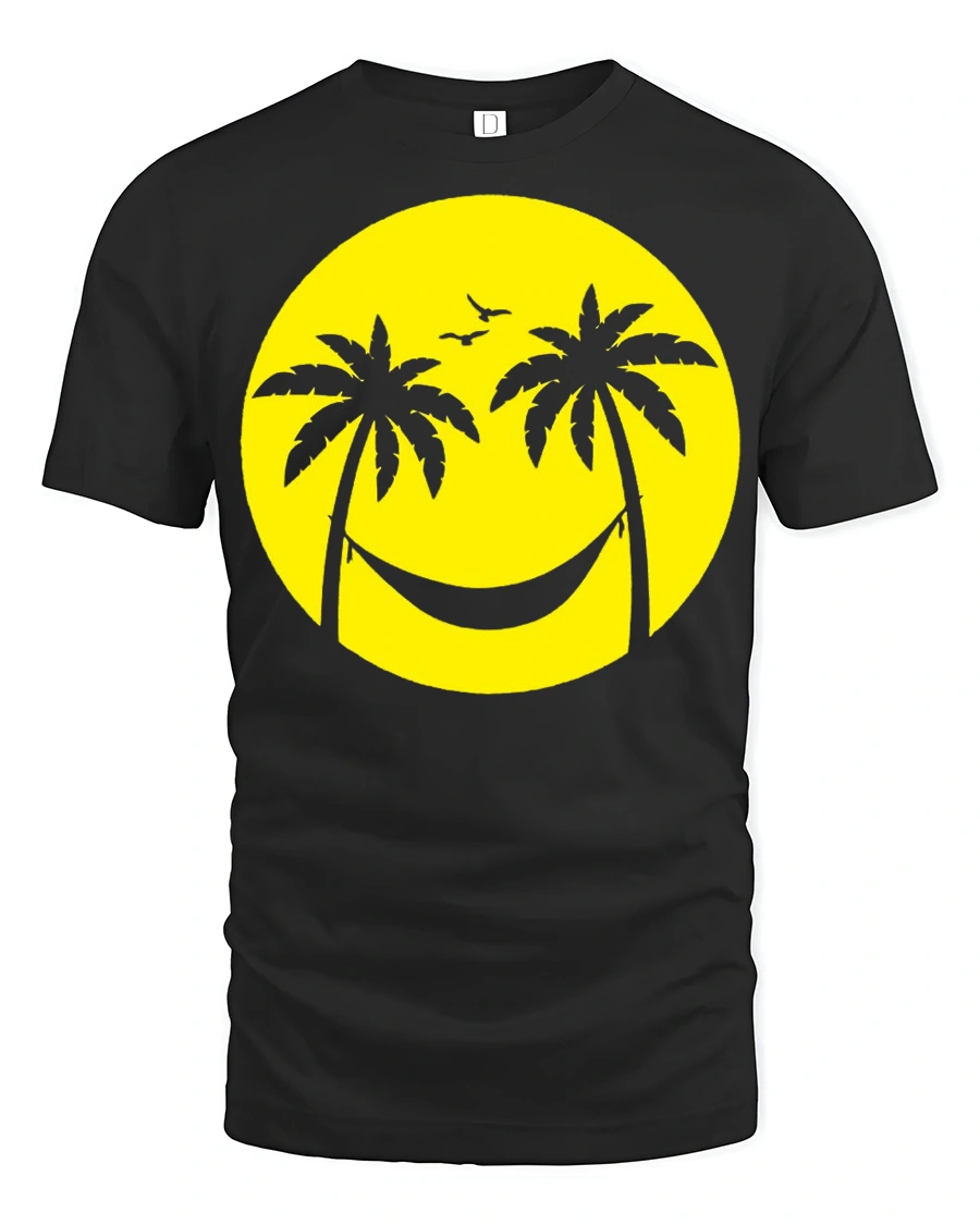 Relaxing Beach Smile Palm Trees Hammock Graphic T Shirt Summer Vibes Tee brings laid back island vibes into a fun and eye catching design.