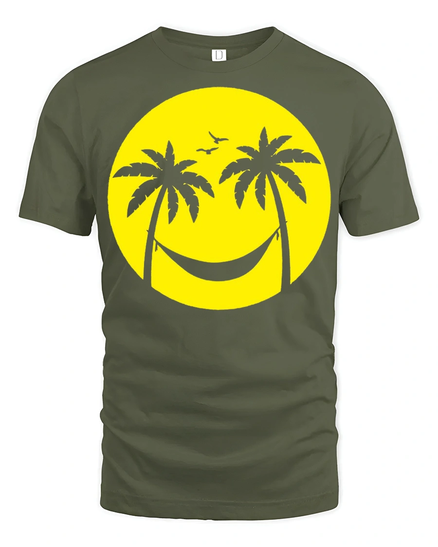 Relaxing Beach Smile Palm Trees Hammock Graphic T Shirt Summer Vibes Tee - military green t-shirt on white background