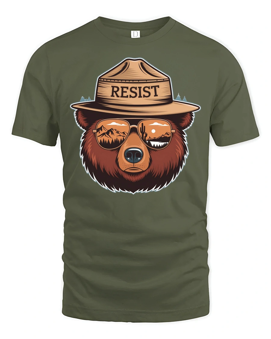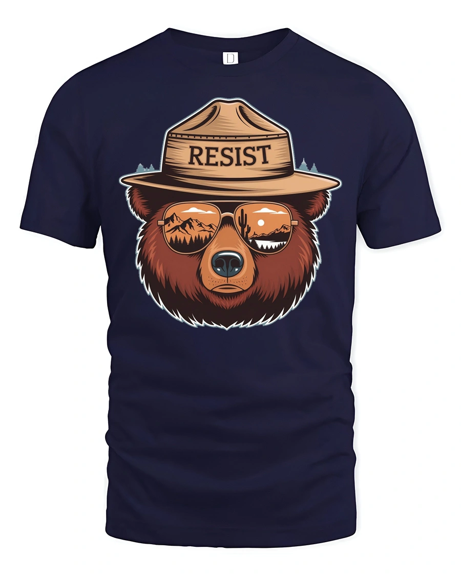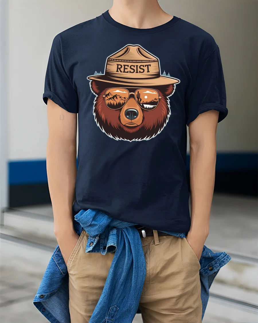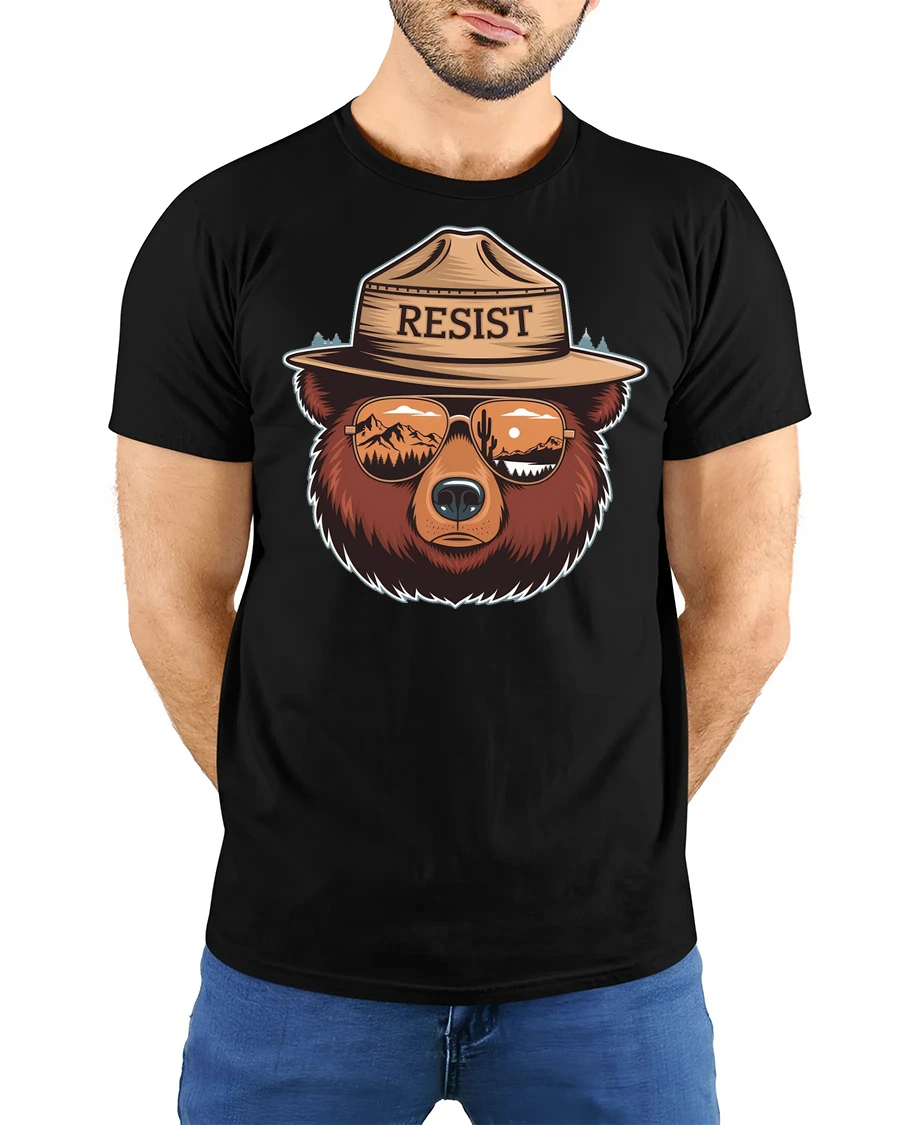 Resist Bear Graphic Tee Nature Lover Adventure Style Tshirt expresses strength, independence, and love for the outdoors through a bold artistic wildlife illustration. The detailed bear portrait combined with reflective mountain scenery in the sunglasses creates a symbolic design representing resilience and connection with nature. This creative composition blends modern style with adventurous spirit, making the graphic visually engaging and meaningful.