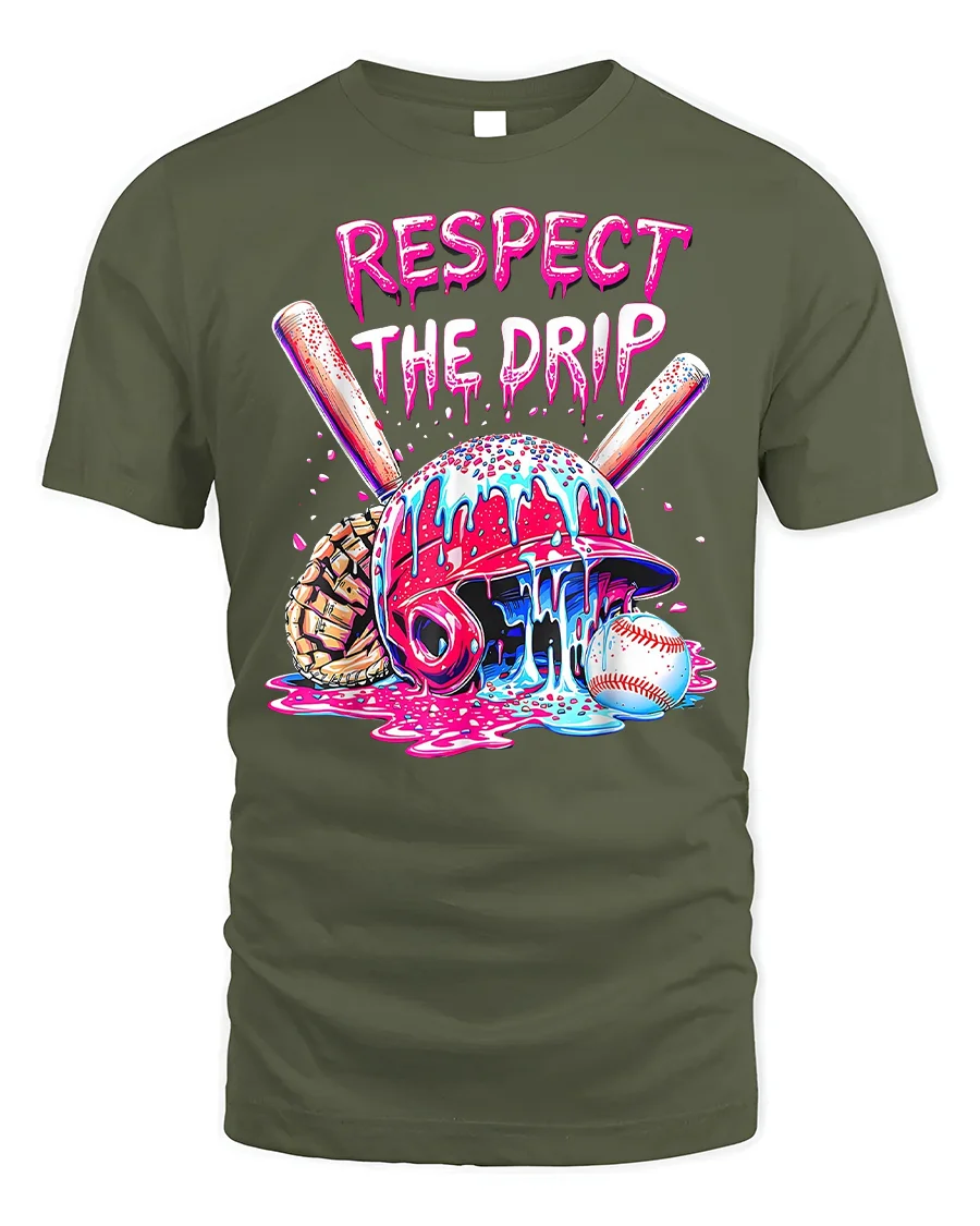 The Respect the Drip Baseball Helmet Graphic T-Shirt is the ultimate choice for baseball fans who want to show off their love for the game with bold and modern style. Featuring a dripping baseball helmet with crossed bats, a glove, and a ball, this baseball graphic t-shirt captures the spirit of the game in a colorful, eye-catching design. With neon-inspired shades of pink, blue, and red, this tee brings streetwear energy to classic baseball culture.