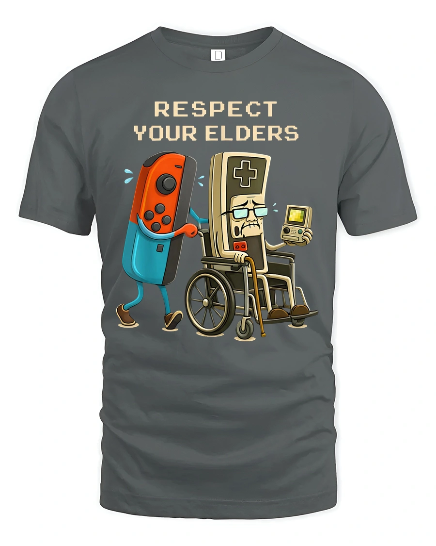 Respect Your Elders Retro Gaming Humor Graphic T Shirt Gamer Tee - gray t-shirt on white background
