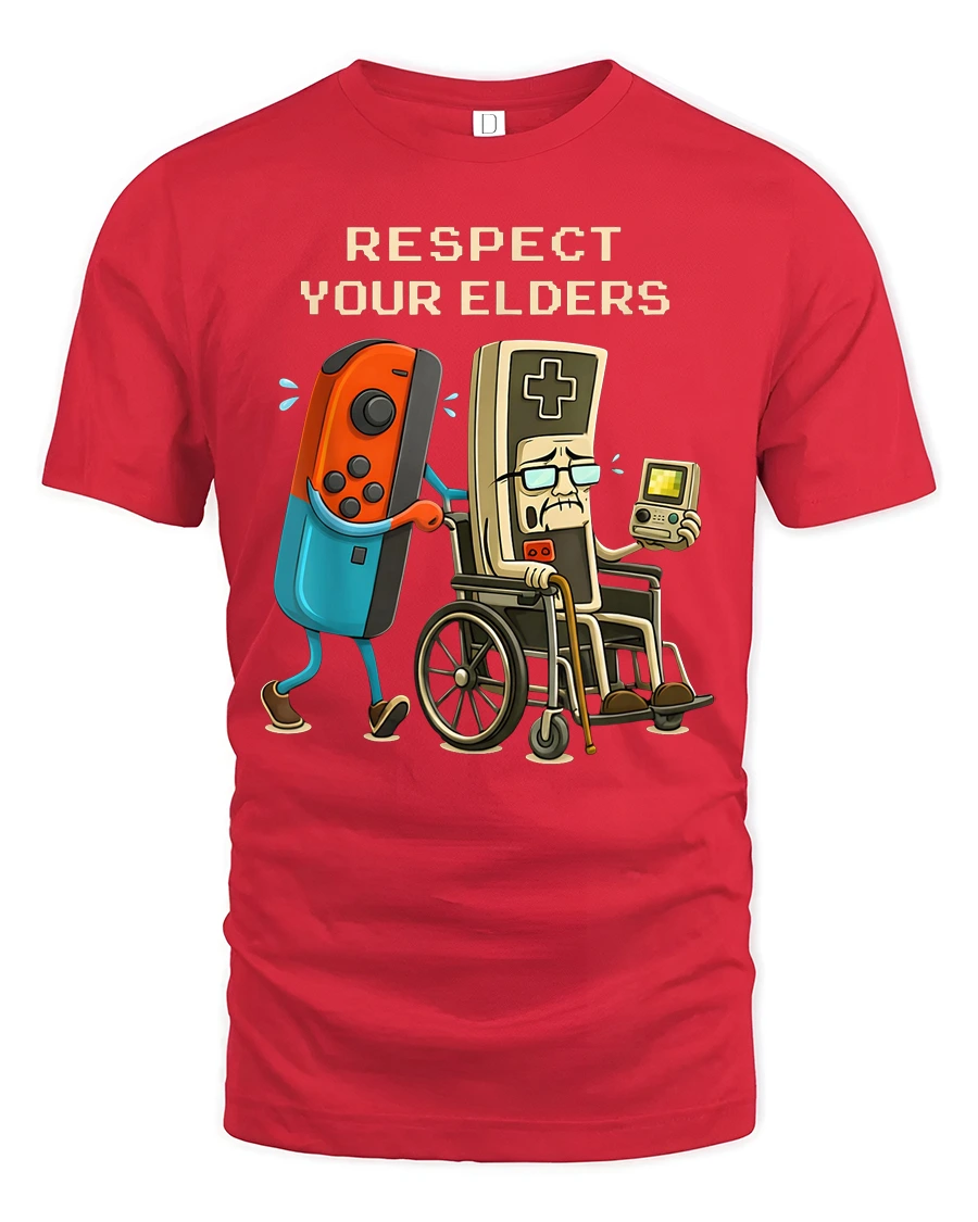 Respect Your Elders Retro Gaming Humor Graphic T Shirt Gamer Tee - red t-shirt on white background