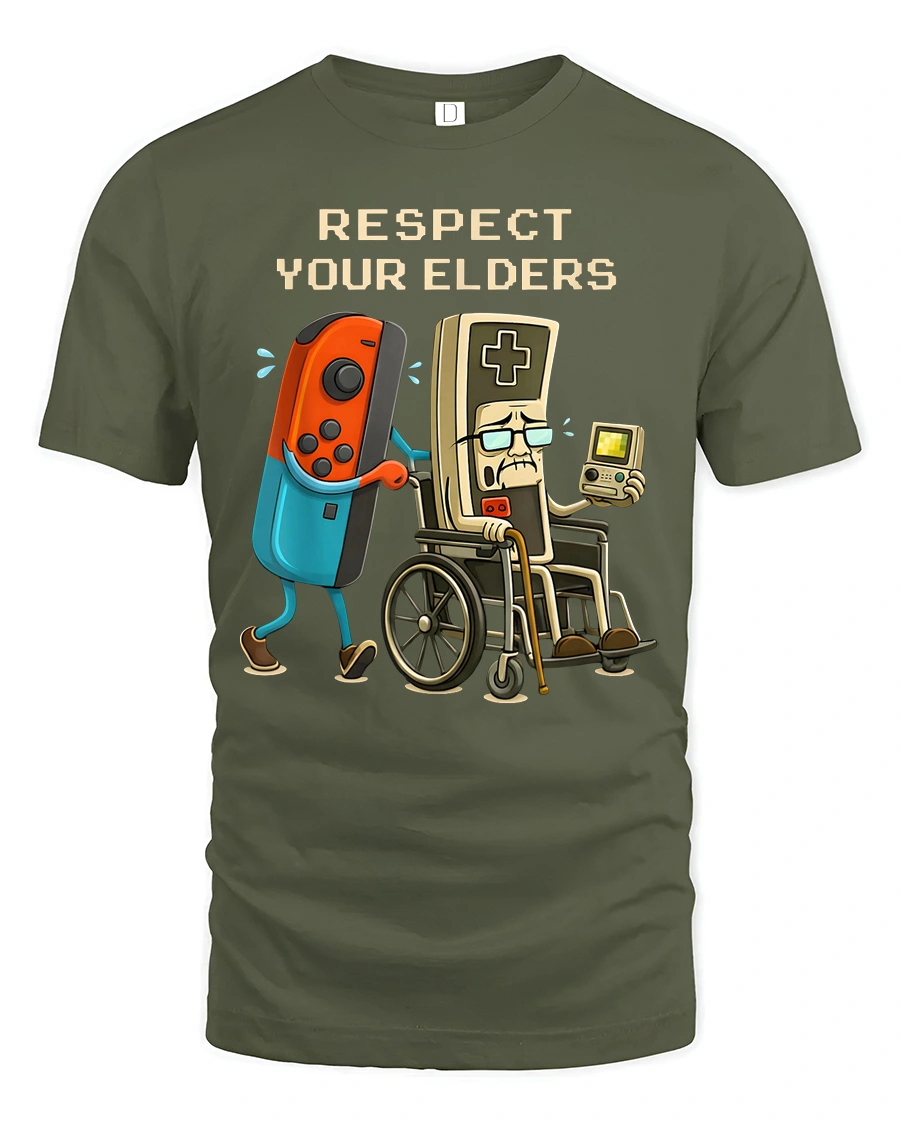 Respect Your Elders Retro Gaming Humor Graphic T Shirt Gamer Tee - military green t-shirt on white background