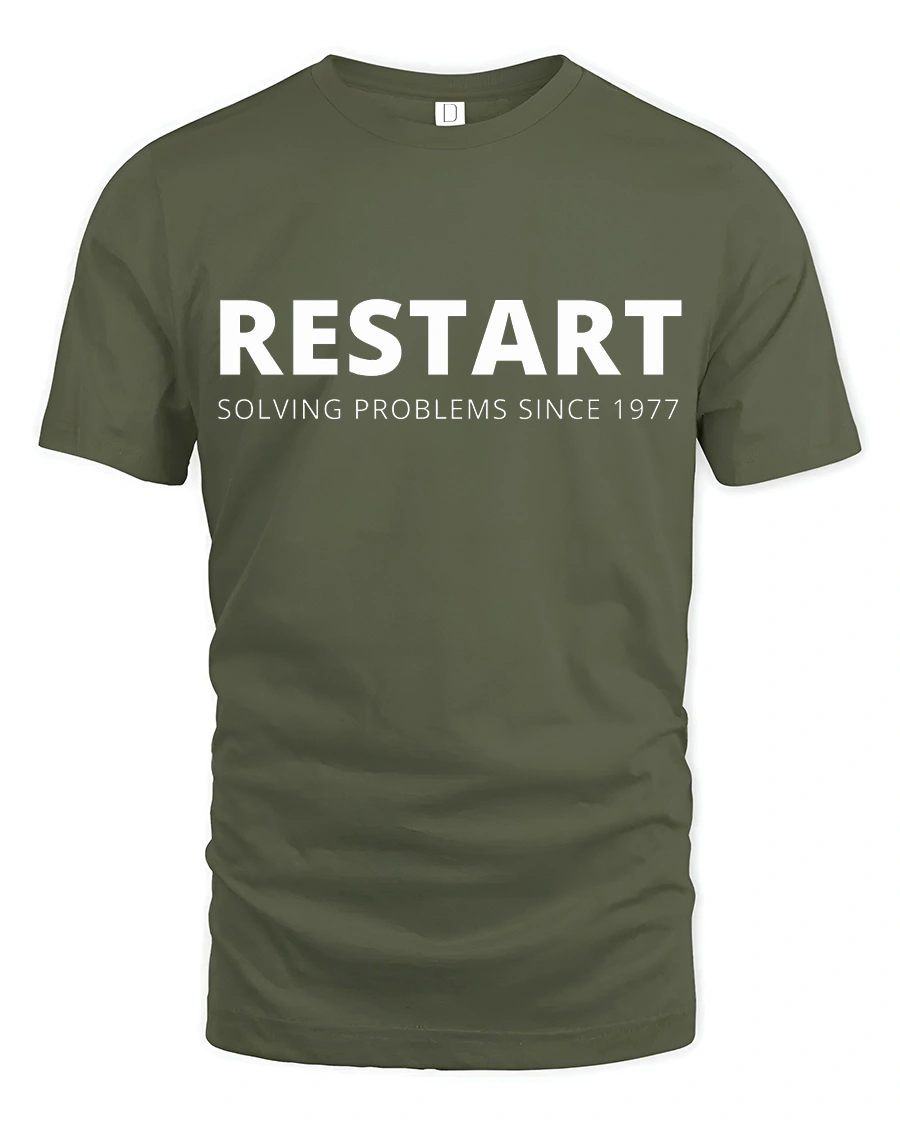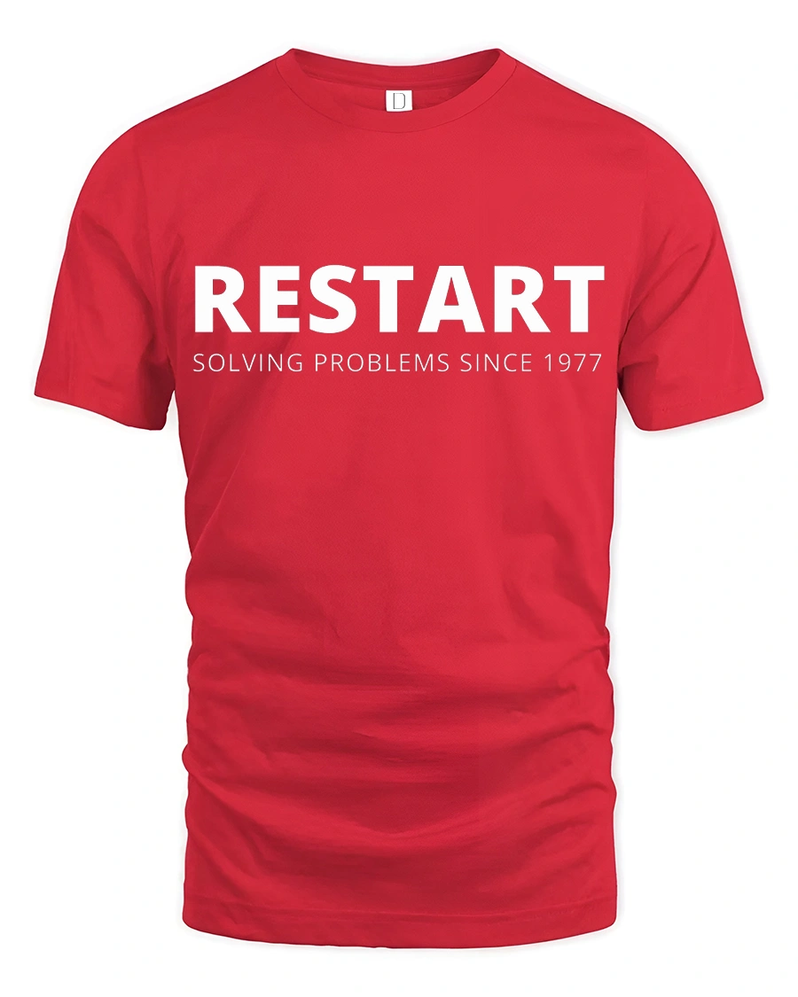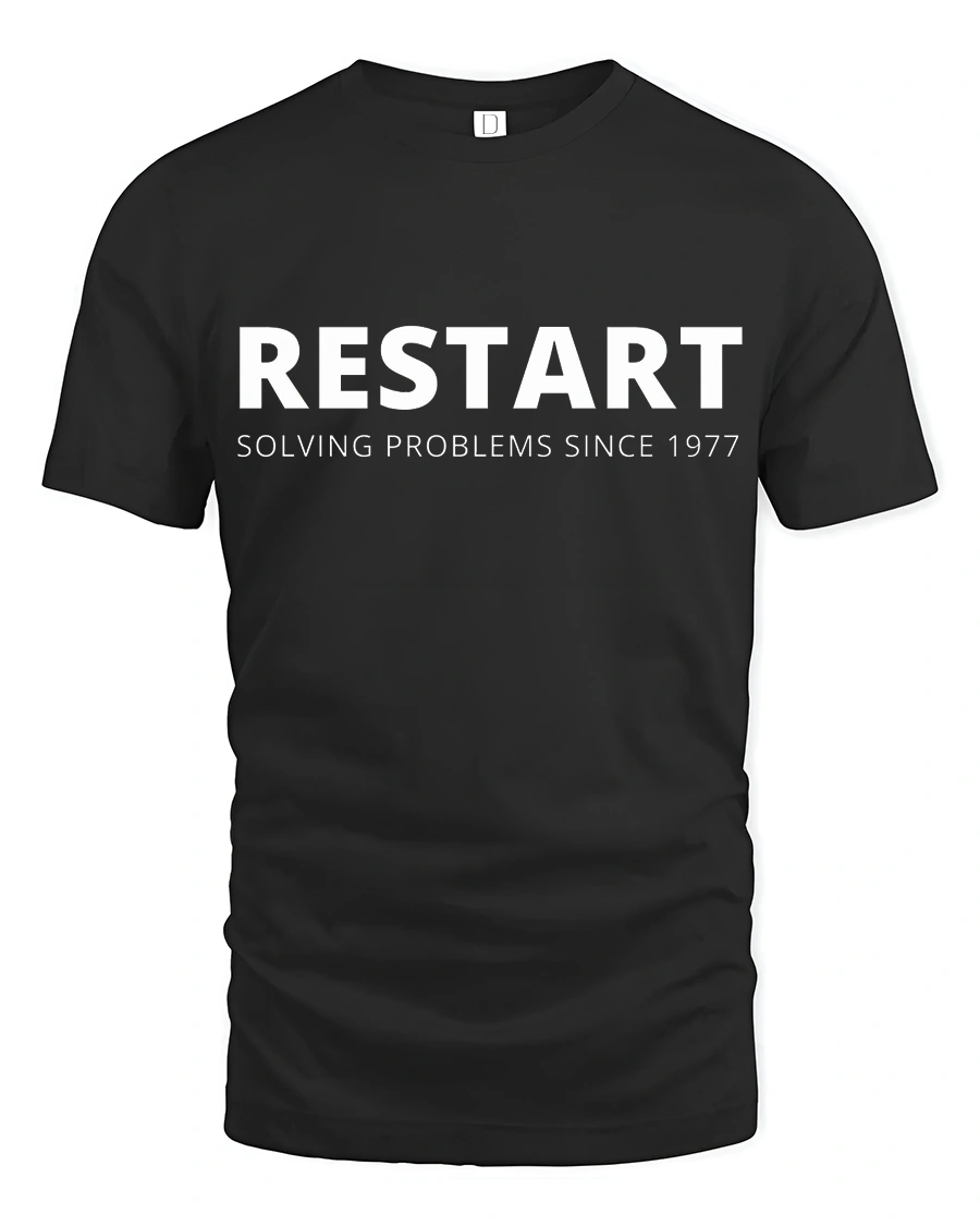 Restart Solving Problems Since 1977 Funny Tech Humor T Shirt celebrates the classic solution every tech enthusiast knows well.