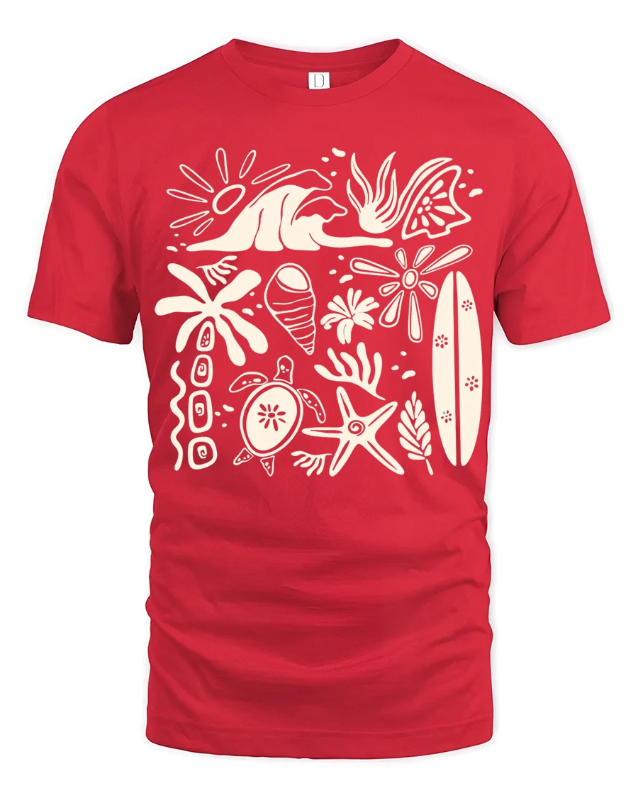 Retro Beach Icons Ocean Summer Coastal Graphic Tee - red t-shirt on white background