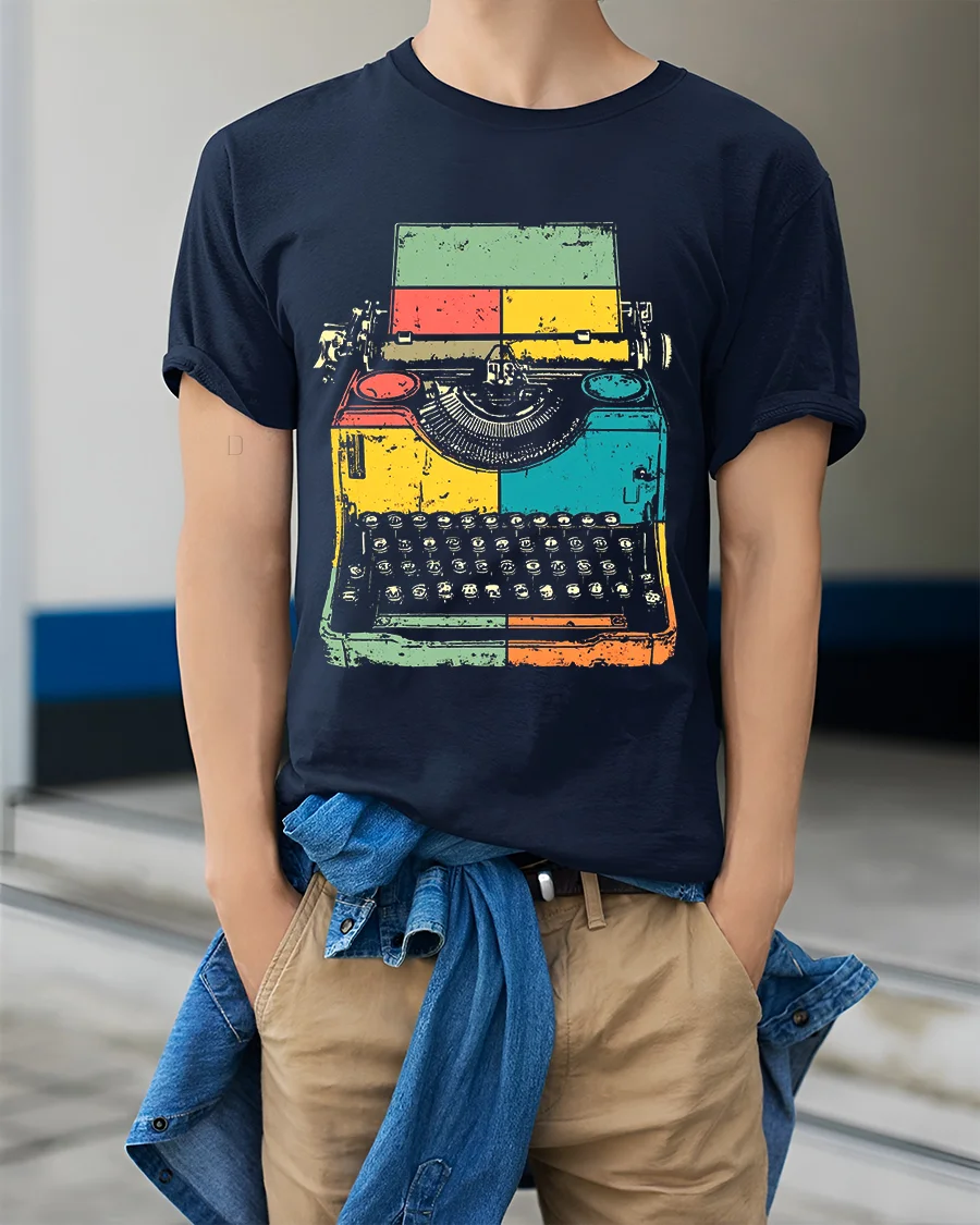Bring a touch of nostalgia to your wardrobe with the Retro Colorful Typewriter Graphic Printed T-Shirt. Featuring a bold and artistic design of a classic typewriter in vibrant retro colors, this shirt is perfect for those who appreciate vintage style with a modern twist. The distressed print effect gives it a unique worn-in look that pairs effortlessly with jeans, shorts, or casual pants, making it a versatile choice for everyday wear.