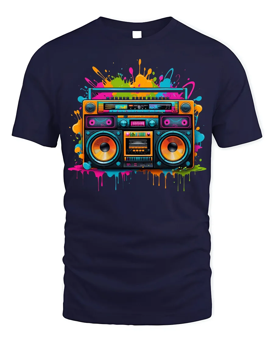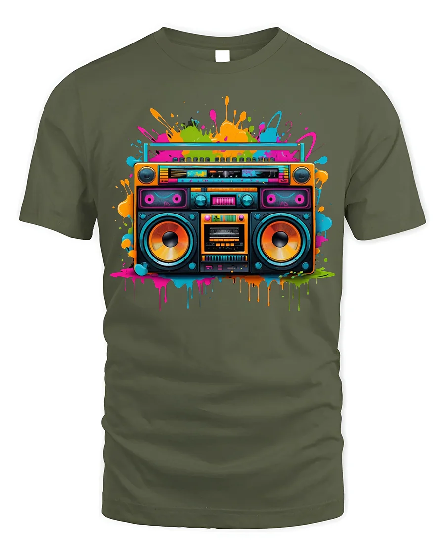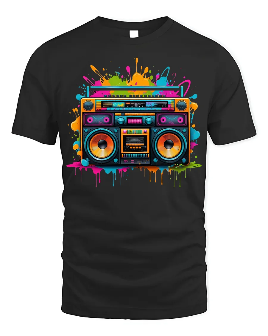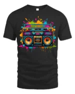 The Retro Neon Boombox Paint Splash Graphic T-Shirt is a bold fusion of nostalgia and modern art, designed for those who live and breathe music and color. Featuring a vividly detailed boombox surrounded by splashes of neon paint, this shirt captures the electric vibe of the 80s with a fresh, artistic twist. The dynamic colors—pink, orange, green, and blue—create a standout look that feels alive and full of rhythm.