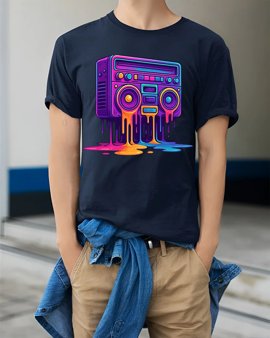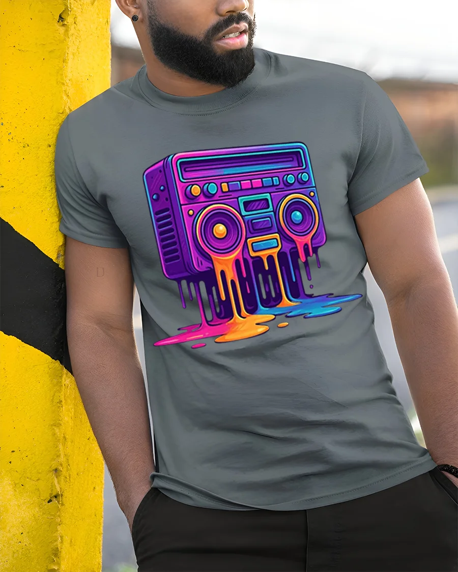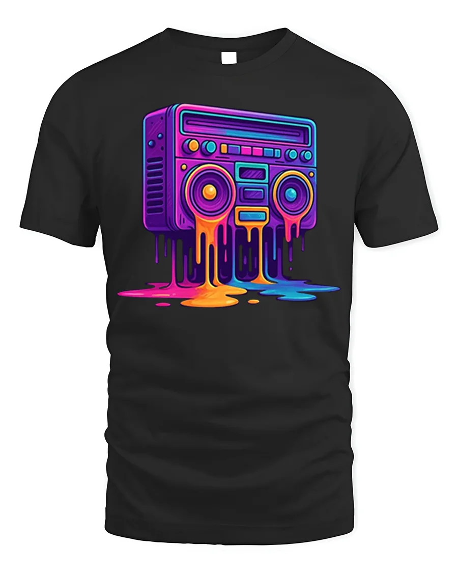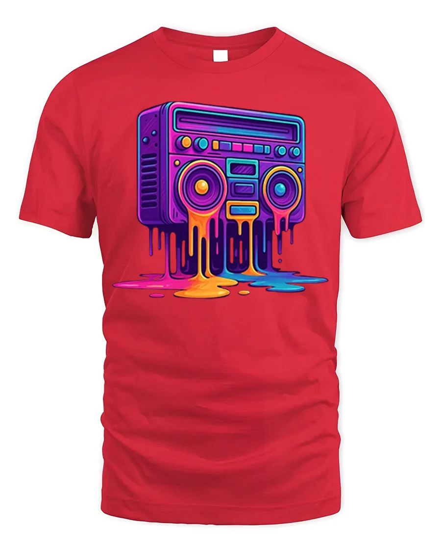 Crafted from soft, high-quality cotton, this melting boombox t-shirt offers a smooth feel and lasting comfort throughout the day. The vivid print uses durable inks that resist fading, keeping the design as fresh and dynamic as your playlist. Whether you wear it at concerts, festivals, or just out and about, it makes an instant statement.